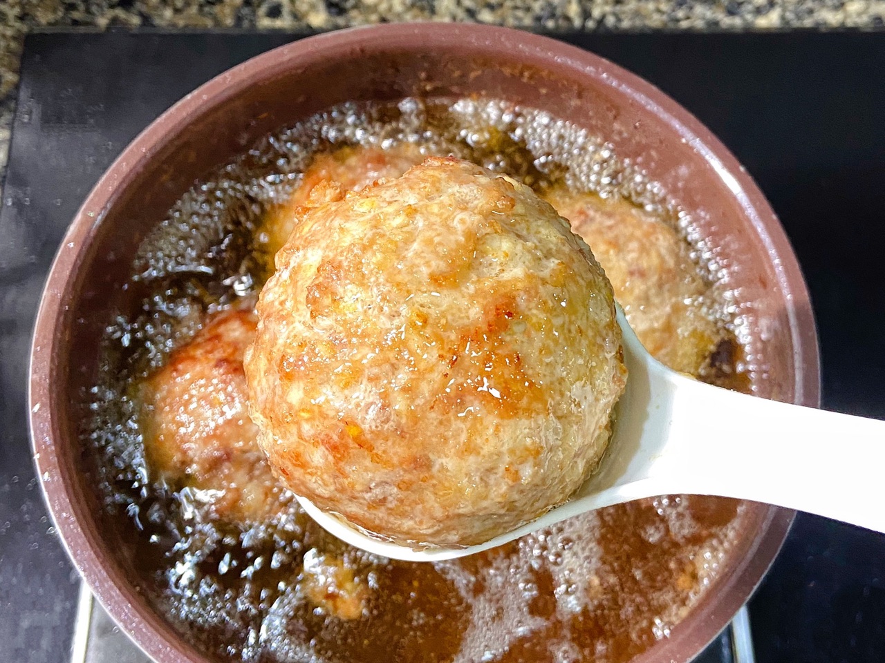 步骤8、将丸子炸到表面金黄后捞出备用。