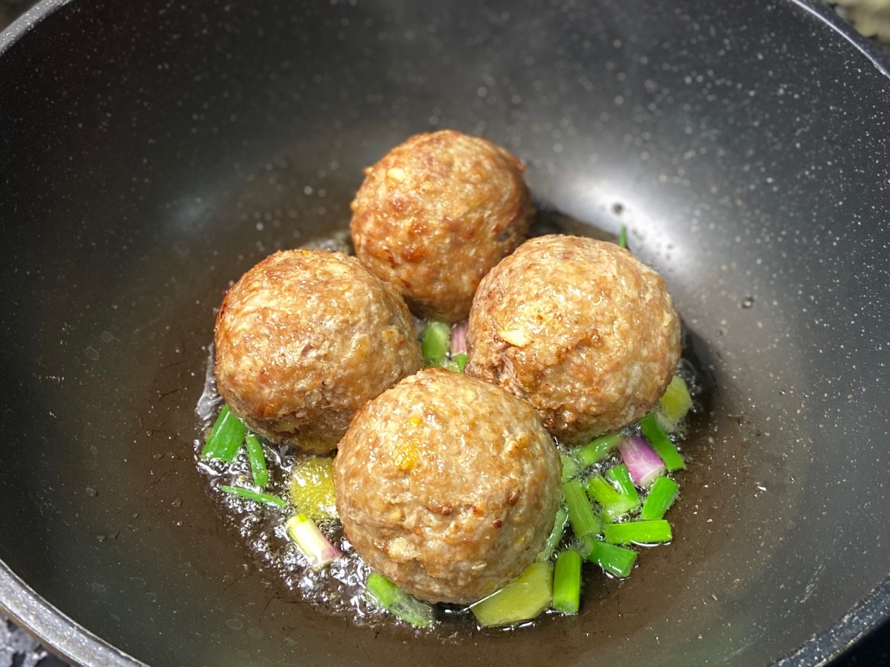 步骤9、锅中倒入适量油,将姜葱爆出香味,放入丸子。