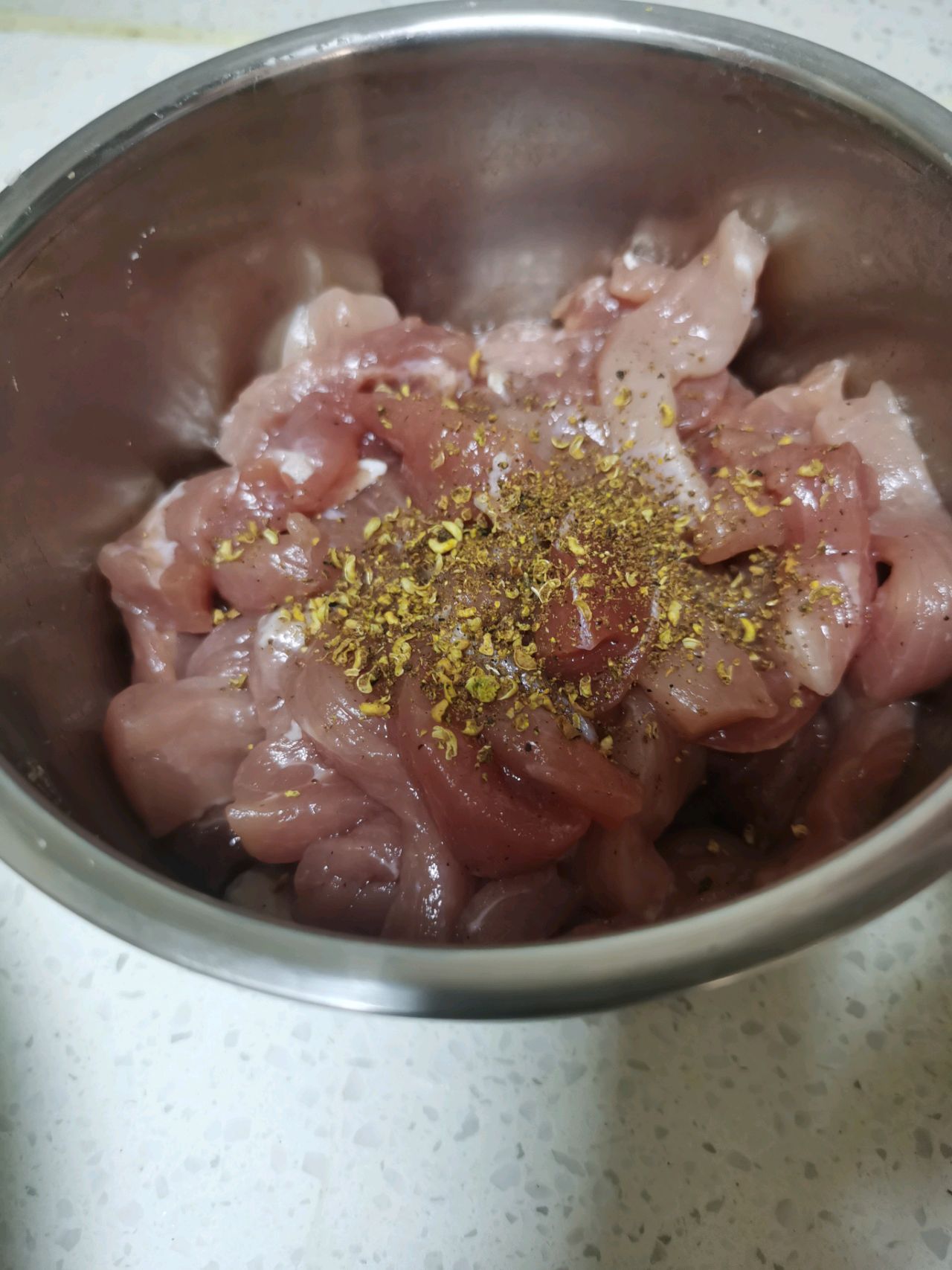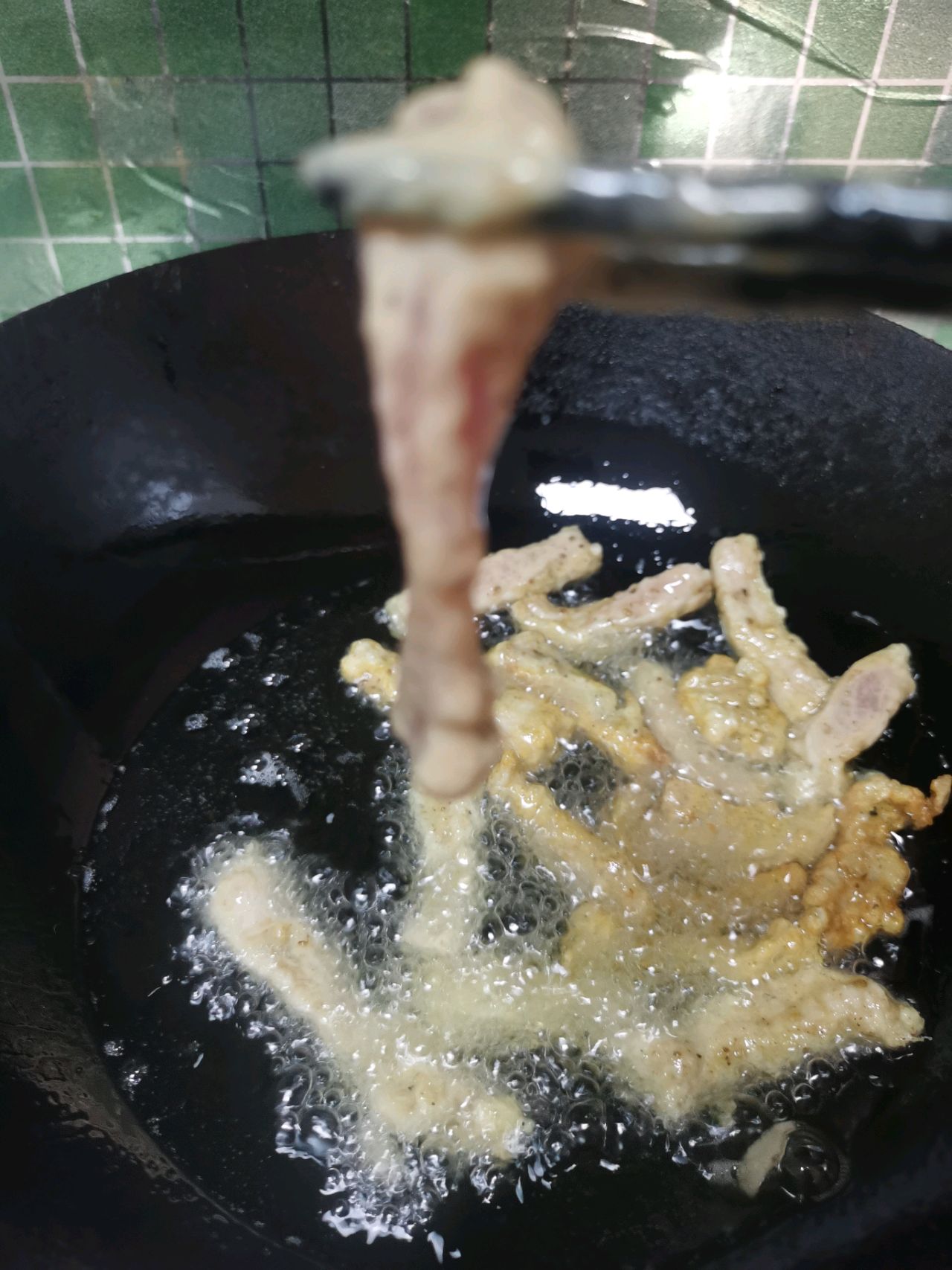 辅料:嫩肉粉或红薯粉30克、面粉10克、盐5克、胡椒面适当、花椒面适当