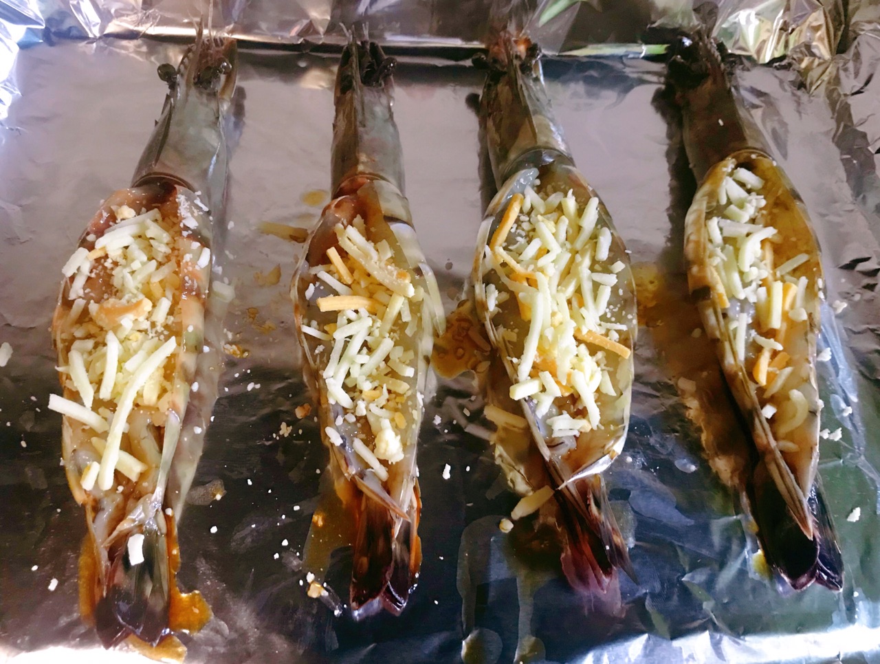 步骤6、在虾背撒上马苏里拉芝士烤箱200度烤12分钟