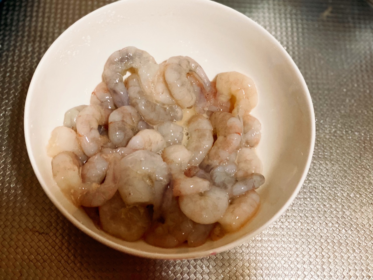 步骤2、虾仁可以买现成的,也可以买鲜虾自己剥,洗干净剔除虾线后,加入适量盐,料酒,淀粉抓匀,腌十分钟,也可以加入一个鸡蛋清,但我这次没加蛋清