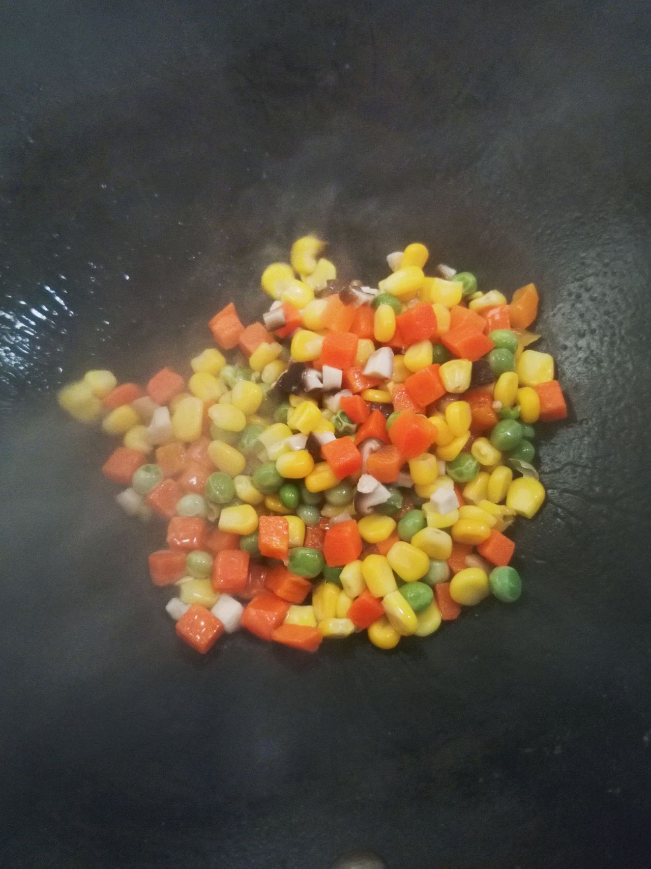 步骤2、胡萝卜切丁,香菇切丁,与玉米粒和青豆一起焯水至断生,水里加油和盐。(也可以炒熟)