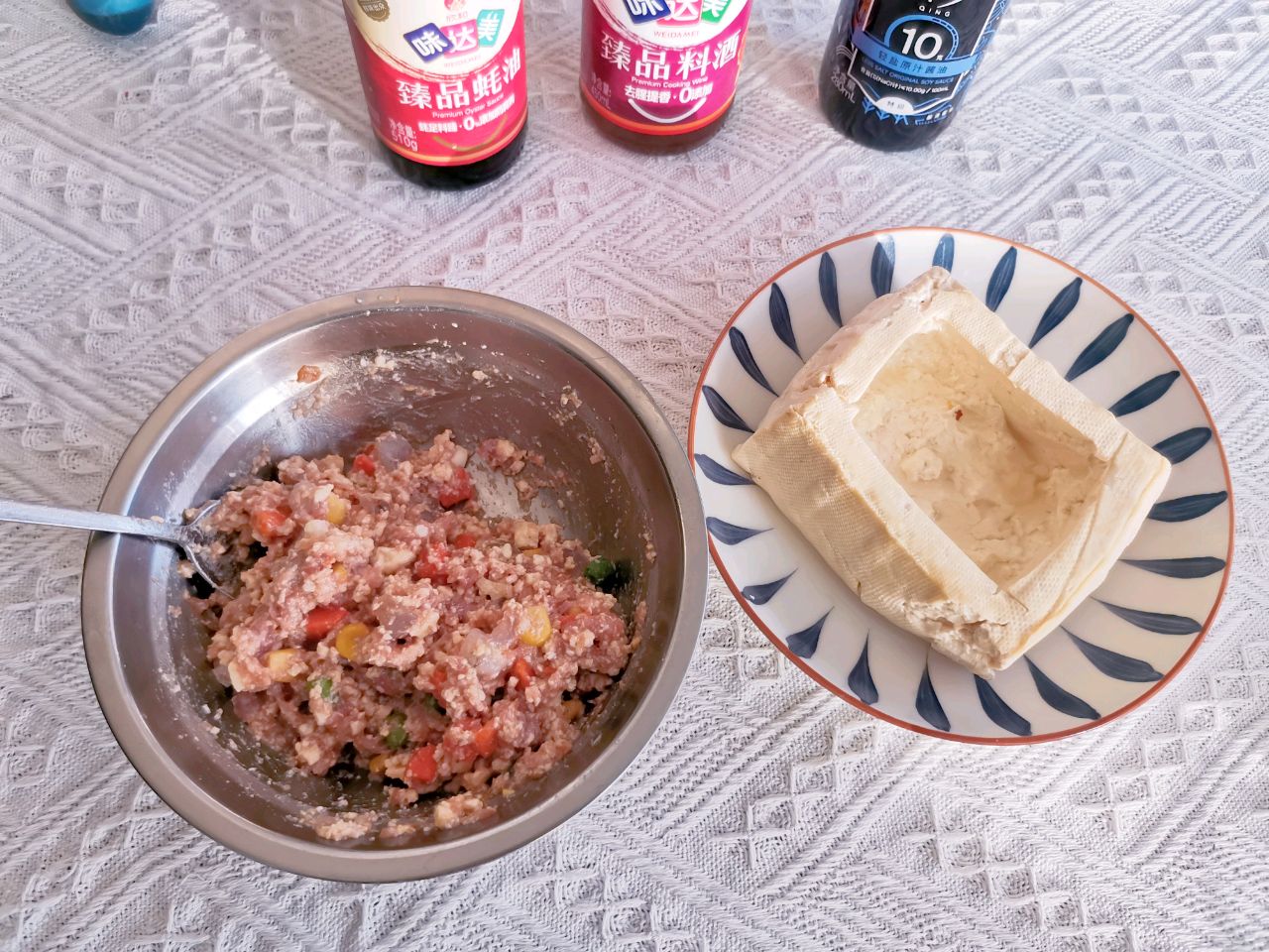 步骤5、把蔬菜、肉馅、挖下来的豆腐,用味达美10克轻盐原汁酱油、味达美臻品料酒、味达美臻品蚝油、五香粉、胡椒粉、糖、盐、姜末、鸡蛋清、淀粉搅拌均匀