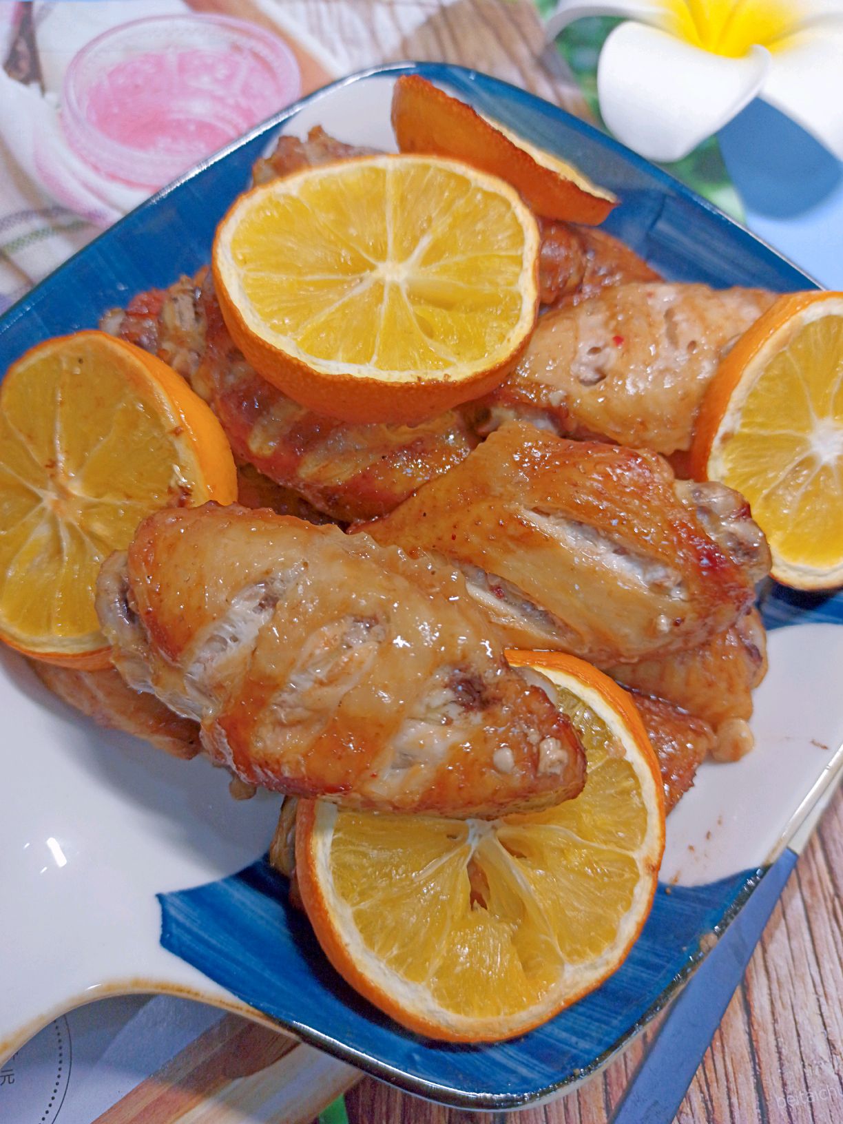 步骤5、烤盘铺上油纸或者锡纸,摆入鸡翅,把柠檬摆在鸡翅上面
