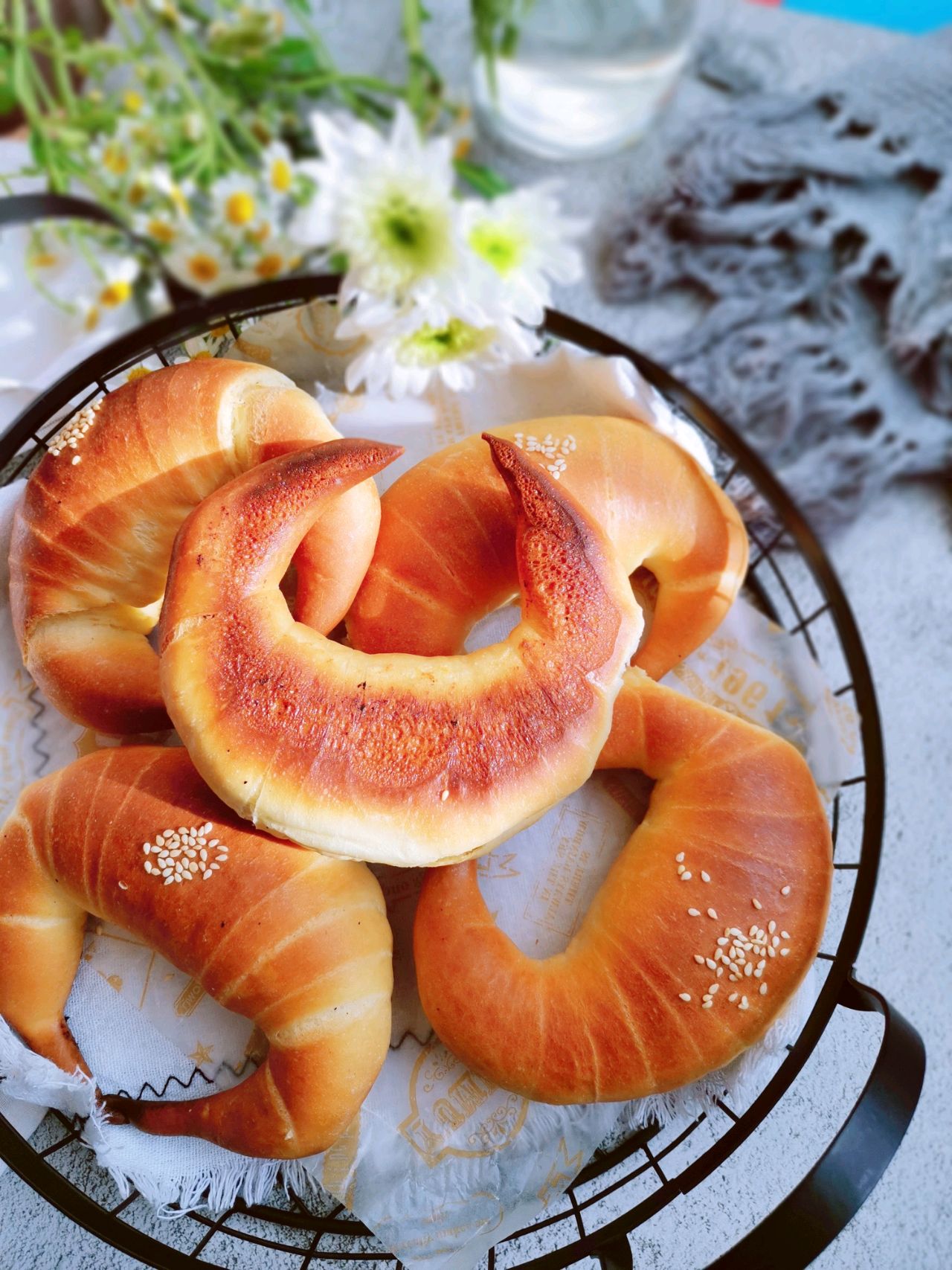辅料:鲜酵母(干酵母)9g(3克)、全蛋液50g、水115克、细砂糖20g、海盐3g、黄油A(面团用)20g、白芝麻适量、黄油B(烘烤用)30克