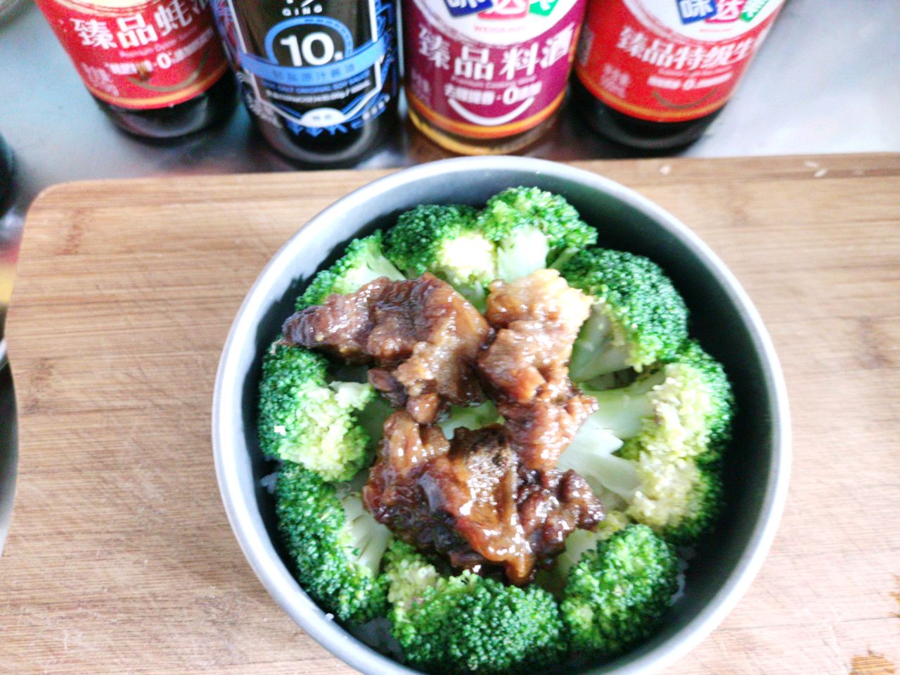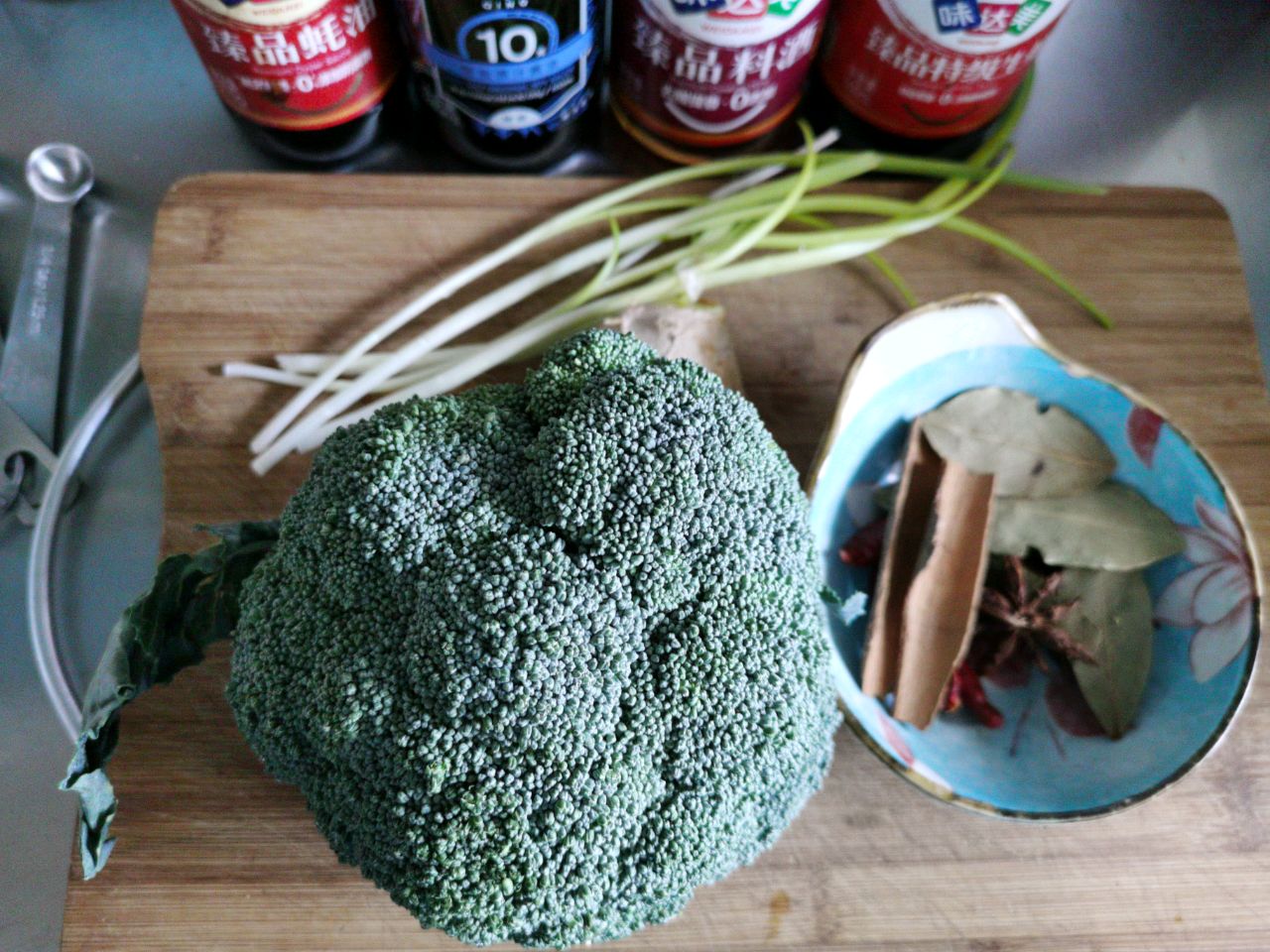 辅料:葱适量、盐适量、糖适量、味达美冰糖老抽酱油适量、西蓝花1颗、欣和六月香原酿辣椒酱1勺、八角2个、桂皮1块、香叶5片、味达美臻品料酒2勺、味达美米醋2勺、味达美臻品耗油2勺