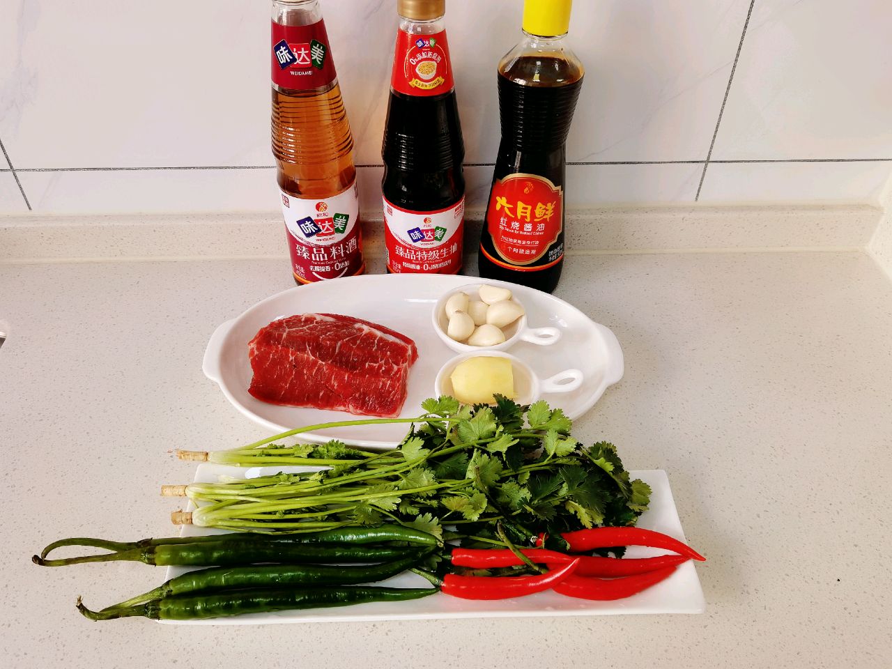 辅料:味达美臻品特级生抽1勺、六月鲜红烧酱油1勺、香菜3棵、线椒4个、红小米椒5个、蒜6瓣、生姜1块