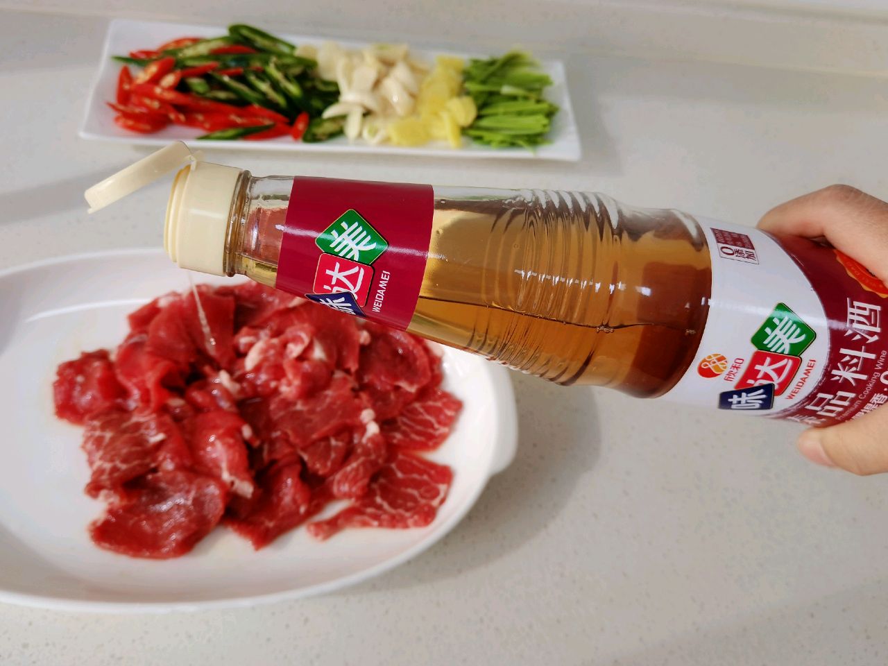 步骤6、牛肉中倒入1勺味达美臻品料酒。