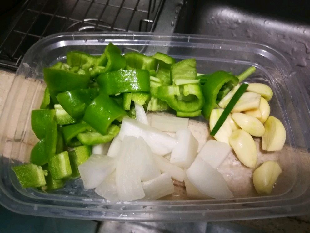 步骤4、准备好姜片+葱段+蒜片+青椒+自泡酸罗卜,待用。