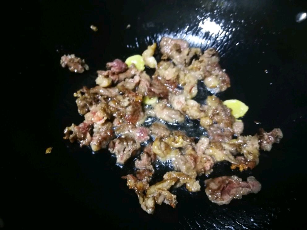 步骤6、大火热锅,烧到冒烟倒入油烧到火爆,放腌好的牛肉进去平铺后10秒翻面又10秒,沿锅边倒入料酒炒均匀。