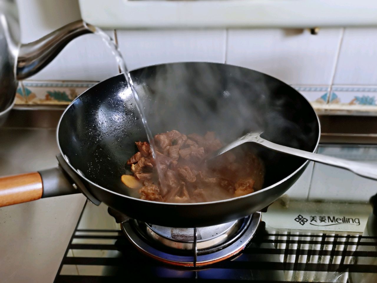 步骤6、炒锅烧热加少量油,加入焯好水的牛肉块翻炒几下,淋入1勺(15克)味达美臻品料酒,1勺味达美臻品特级生抽调味,炒出香味