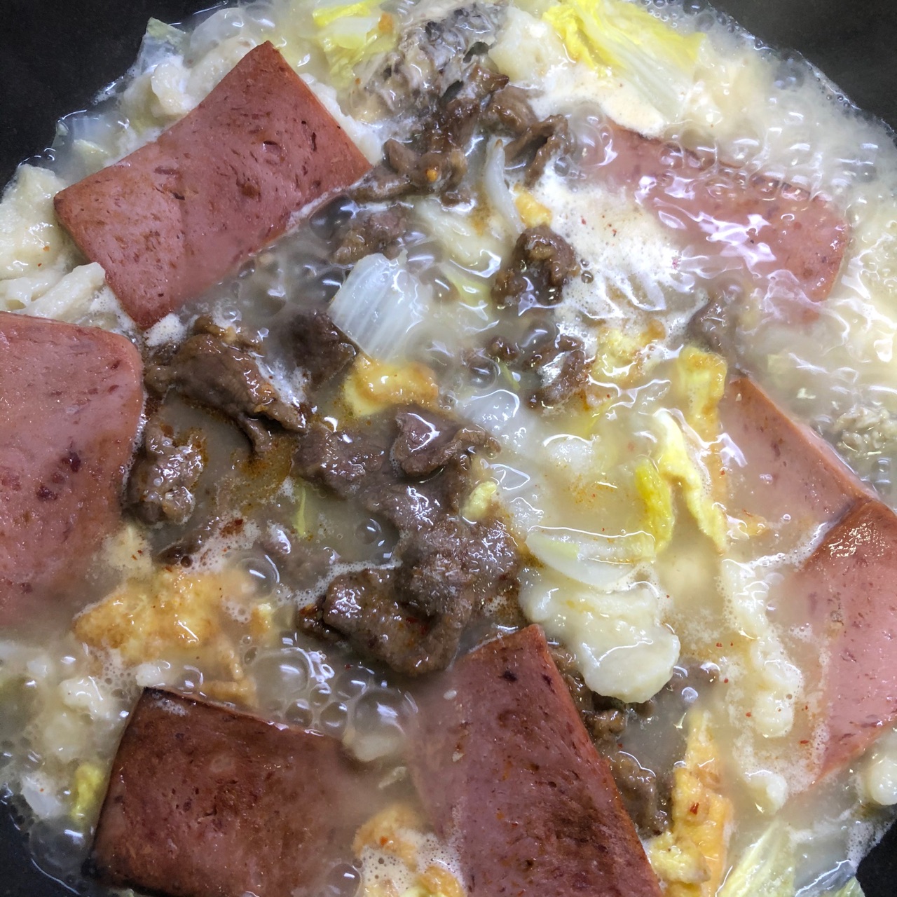 步骤8、先加蛋,再加午餐肉牛肉,略煮煮关火,撒把香菜。能吃辣的加两勺辣椒油更香喔
