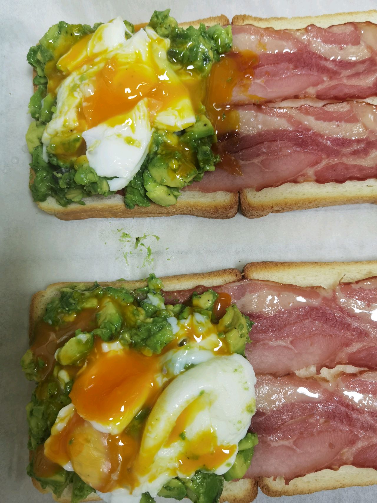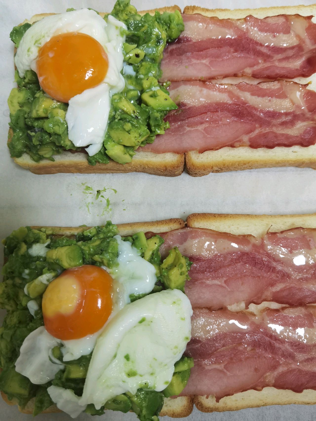 步骤9、把牛油果倒在刚烤完的面包培根上,只倒在其中一片面包上。