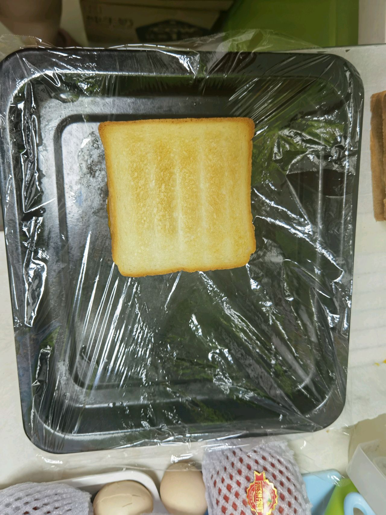 步骤12、撕一张保鲜膜,大小要大于一片面包的两倍