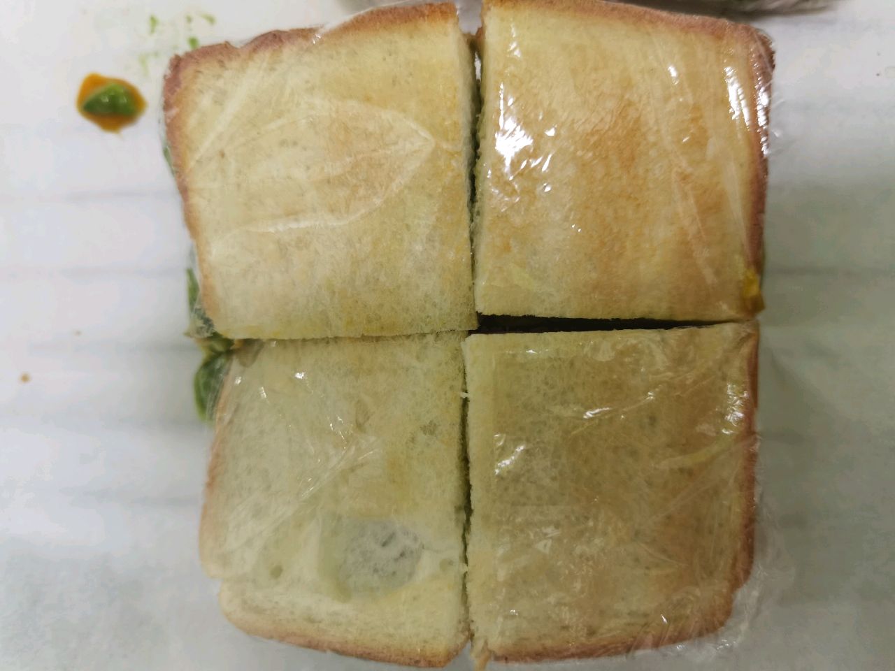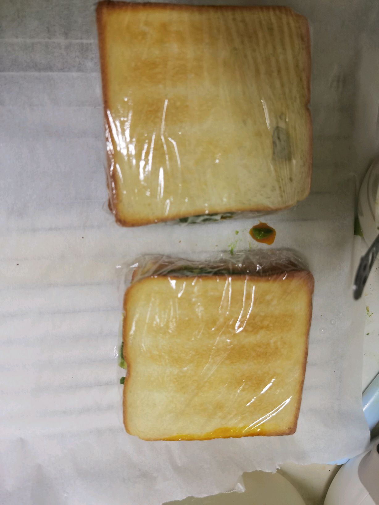 步骤14、把三明治用保鲜膜整体包起来,这样切的时候馅料不会被挤得到处都是。不切的话一个人直接吃也可以。