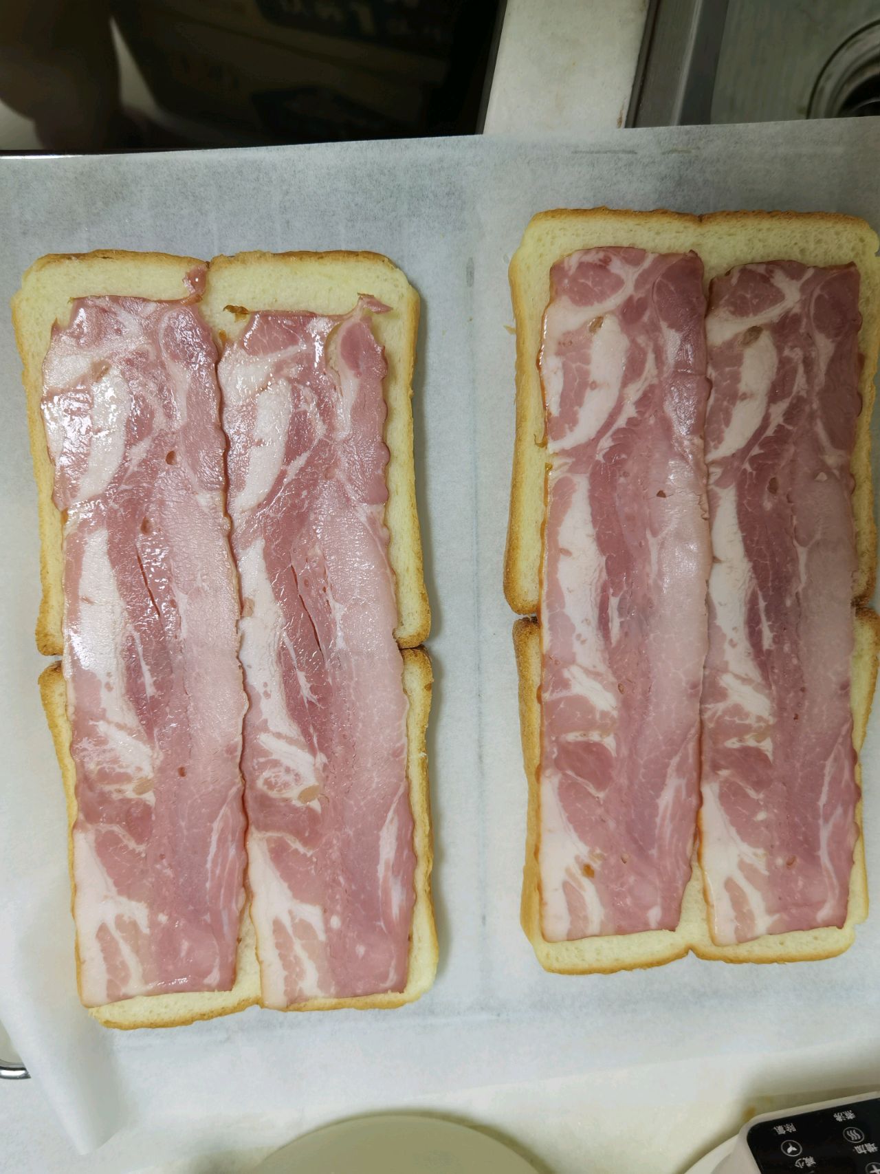 步骤2、将培根片如图铺在面包上。烤箱中层180℃烤10分钟,不用预热。