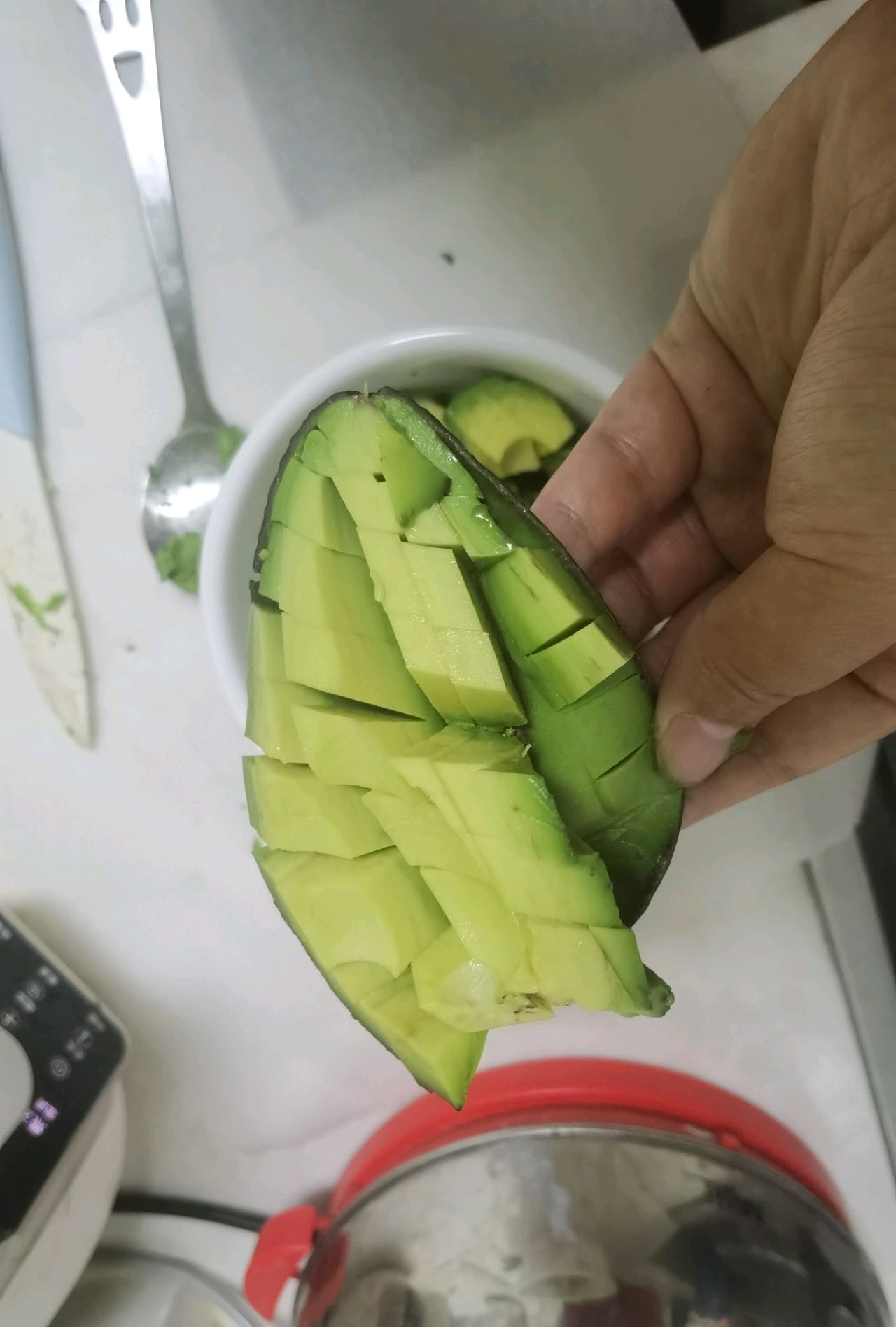 步骤5、用刀尖在牛油果肉上划出一格一格