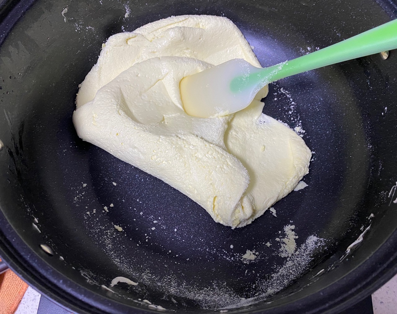 步骤1、原味牛轧糖:黄油倒入不粘锅中小火进行融化;