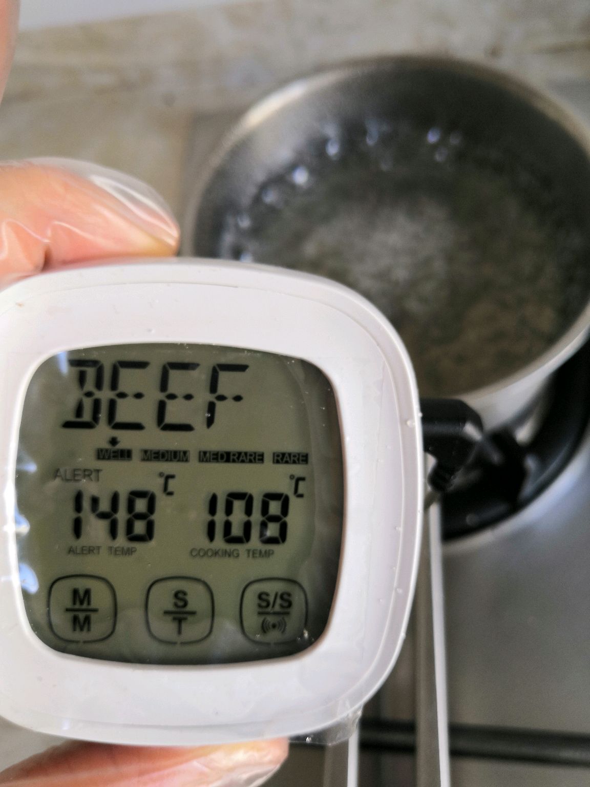 步骤3、糖熬到142度后(我觉得有点软整形后放室温软趴趴的第二次熬到了148度不超过150度就可以)这个根据自己室内温度来决定,多尝试几次就知道熬到多少度合适。