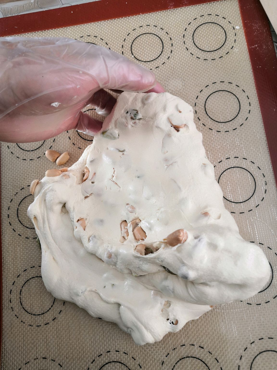 步骤4、糖熬好后一点一点倒入厨师桶,注意不要倒到打蛋头和桶壁上,不然糖很快结块,中速搅拌,然后加入保温的黄油也是一边倒一边搅拌,最后加入奶粉搅拌均匀,用刮刀把糖倒在硅胶垫或者油布,加入干果开始翻拌揉搓,一定要带手套不然很黏。最后放入烤盘整形,温热时切。