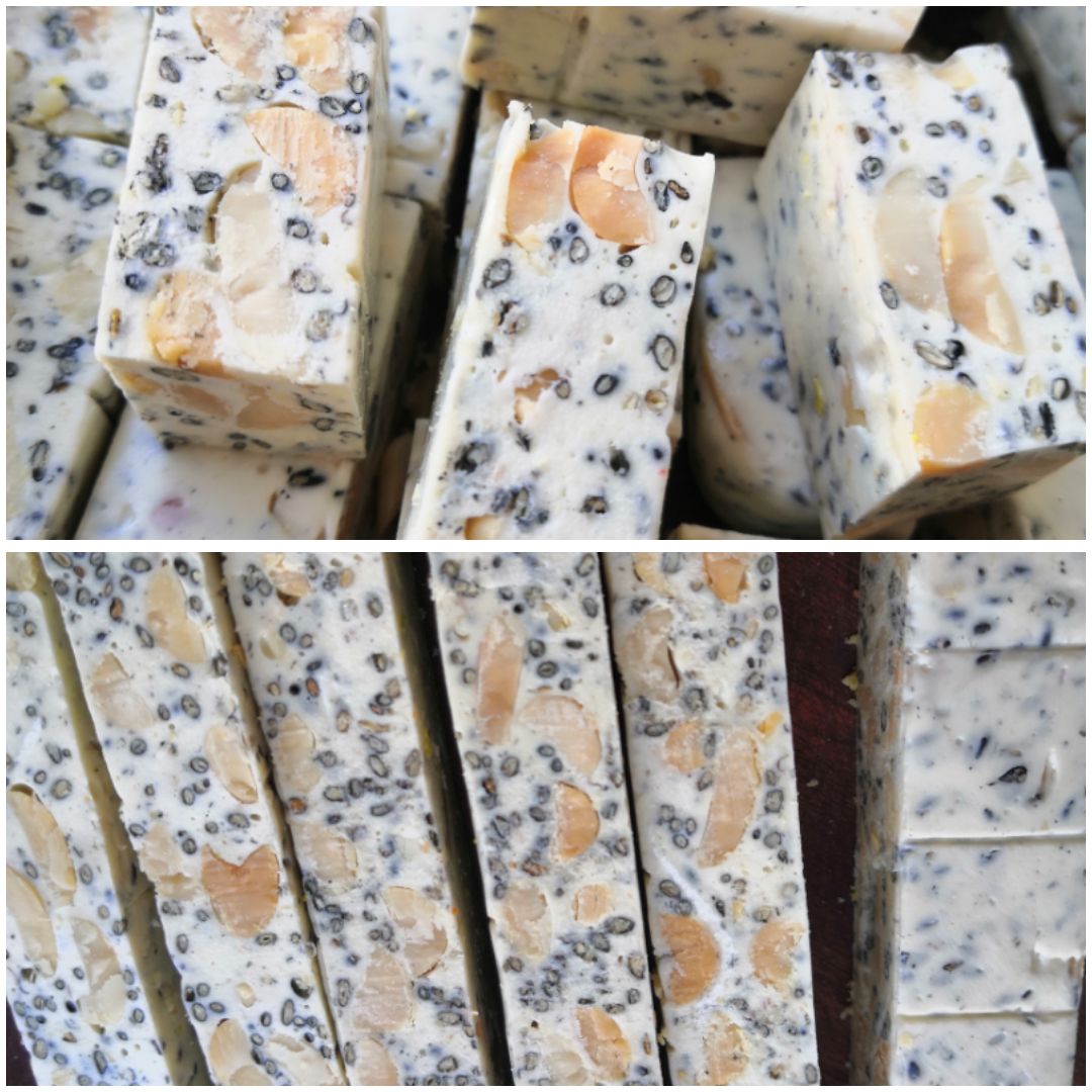 步骤5、原味牛轧糖把草莓粉用奶粉等量替换,草莓干用干果替换,黑芝麻牛轧糖中黑芝麻可替换干果