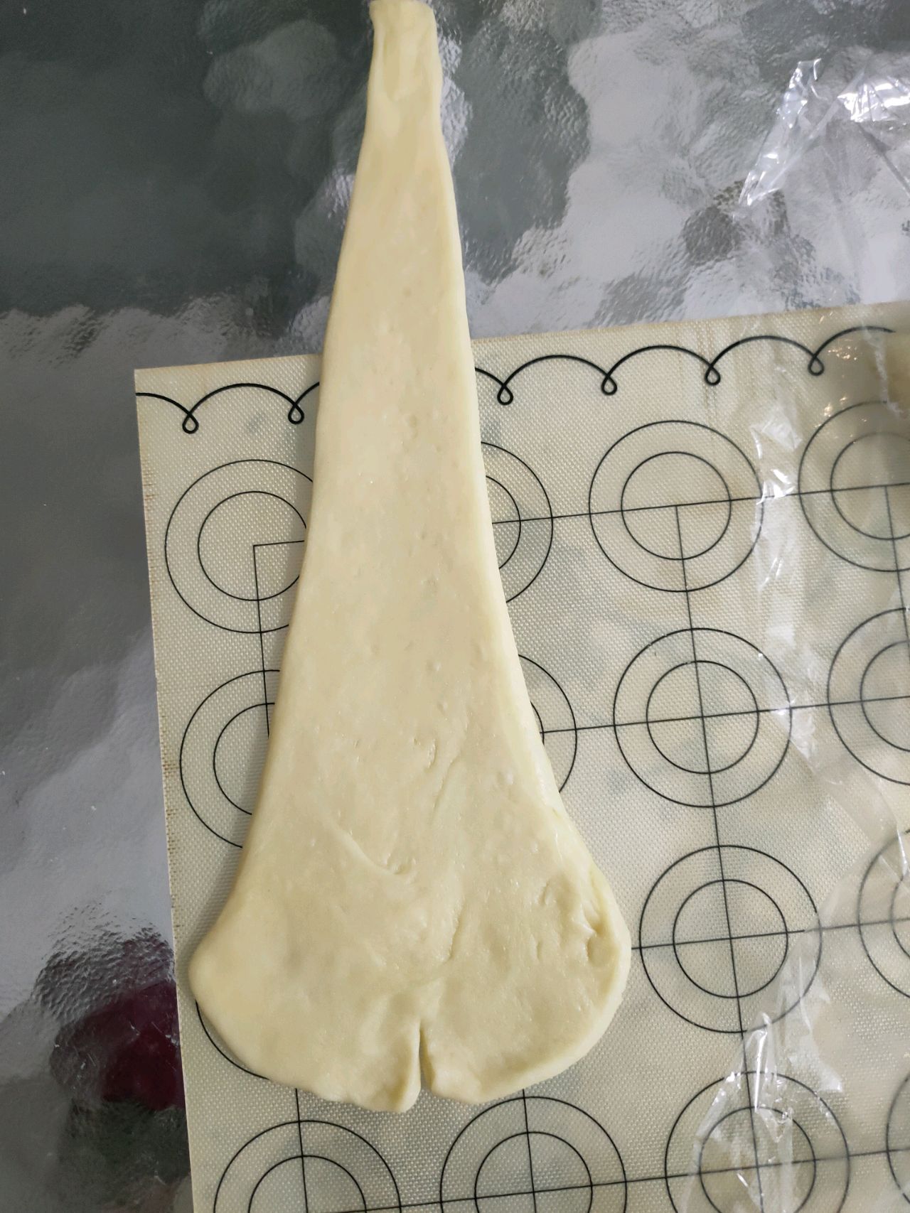 步骤3、擀薄擀长,翻面割个缝卷起来。