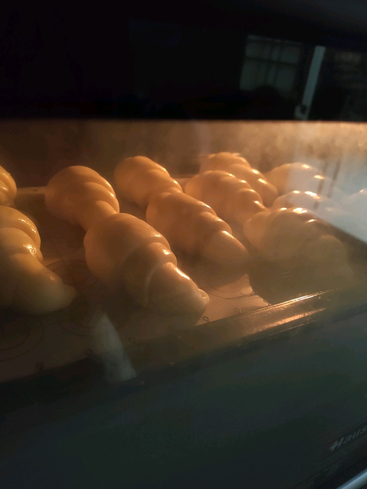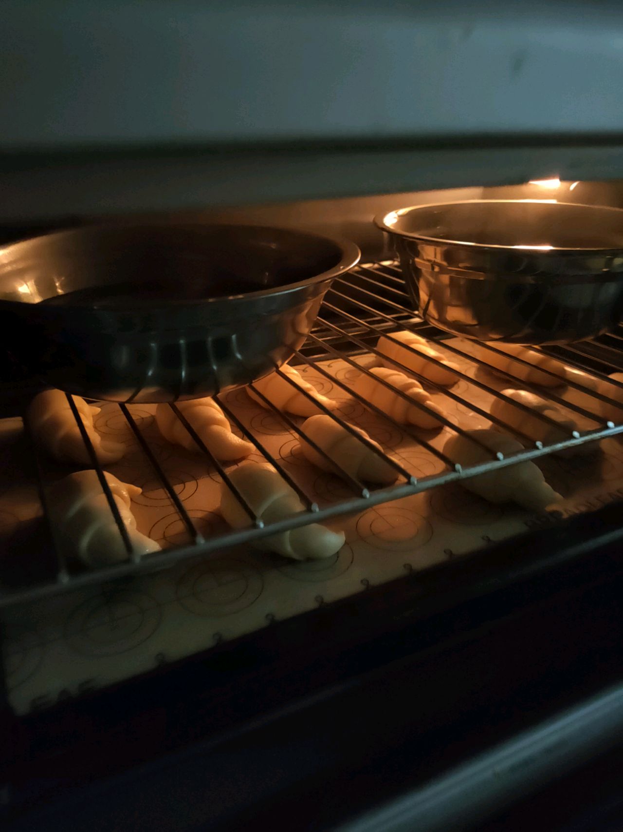 步骤6、放烤箱二发,烤架上放两盆热水。