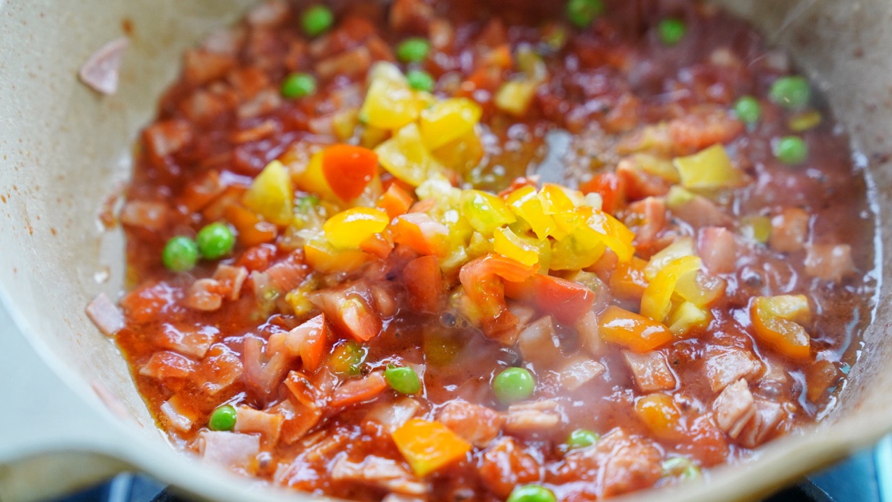 步骤8、锅中倒入少许色拉油,放入火腿片和豌豆翻炒