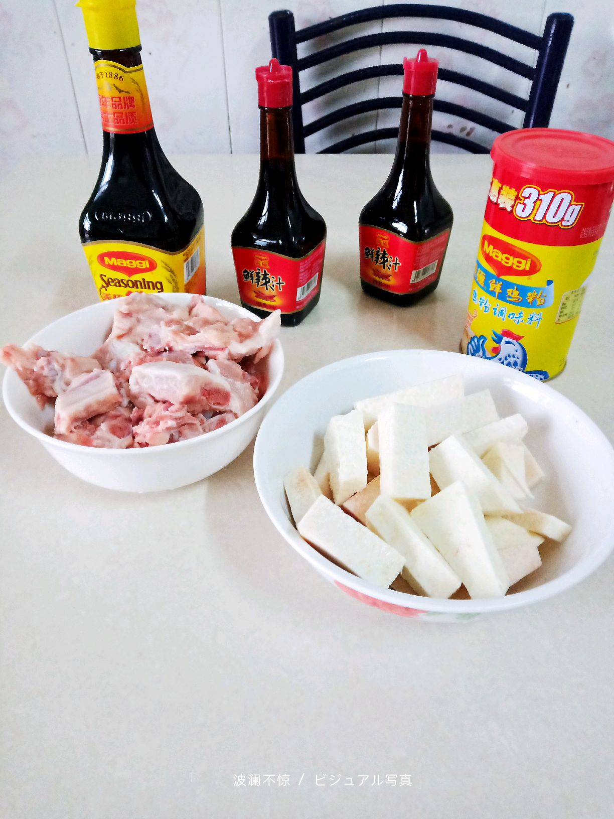 步骤1、准备好食材,香芋削皮切块,排骨泡出血水洗净沥干水待用。