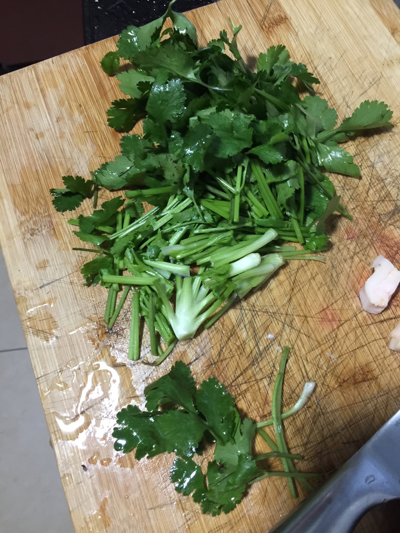 步骤6、等高压锅嫩开了,依次加入肉片、皮蛋、鲍鱼,最后加香菜,再加点盐,煮开即可享用