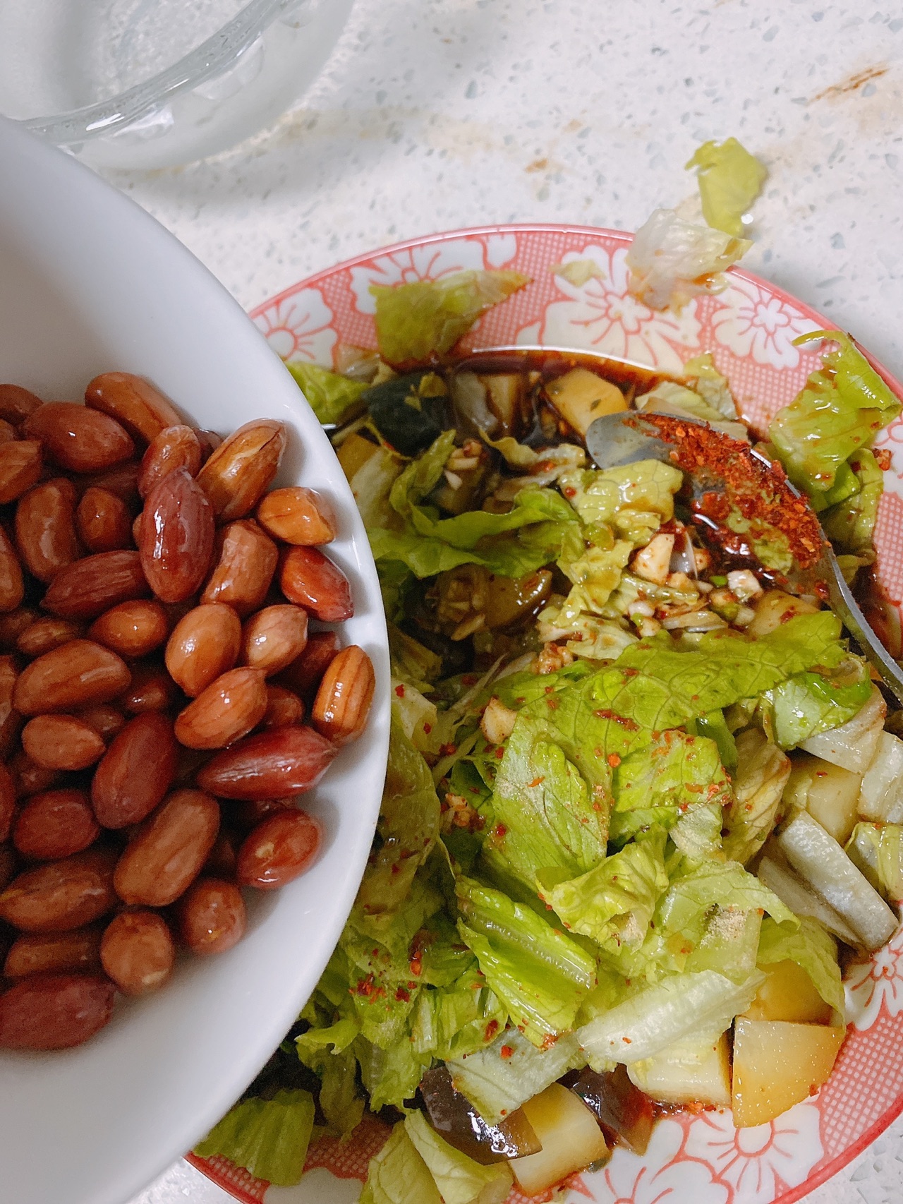 辅料:花生米少许、生菜2片、生抽3勺、蚝油1勺、白醋1勺、香油2勺、蒜瓣4个、胡椒粉1勺、辣椒面1勺、芝麻少许