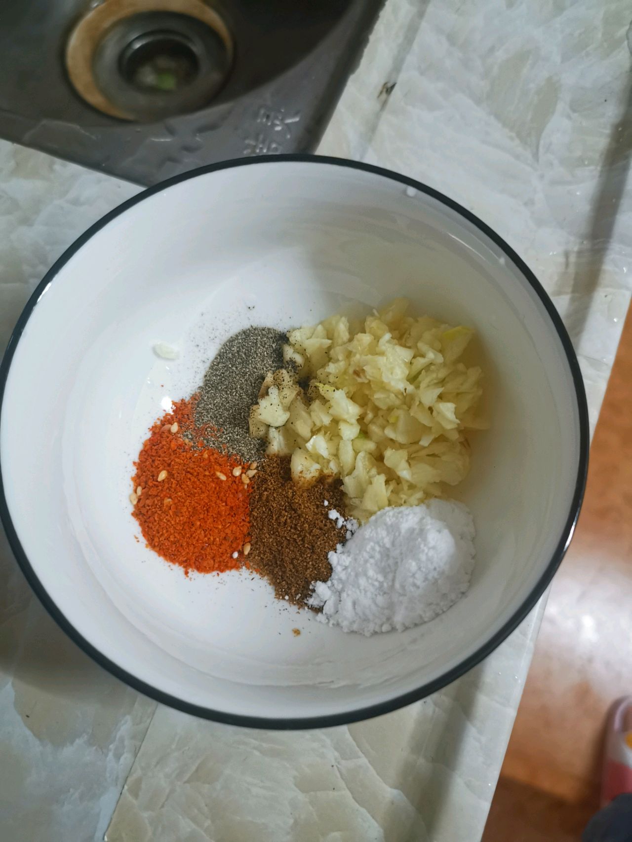 步骤2、蒜剁碎,准备好孜然粉,黑胡椒粉,辣椒面,白糖。