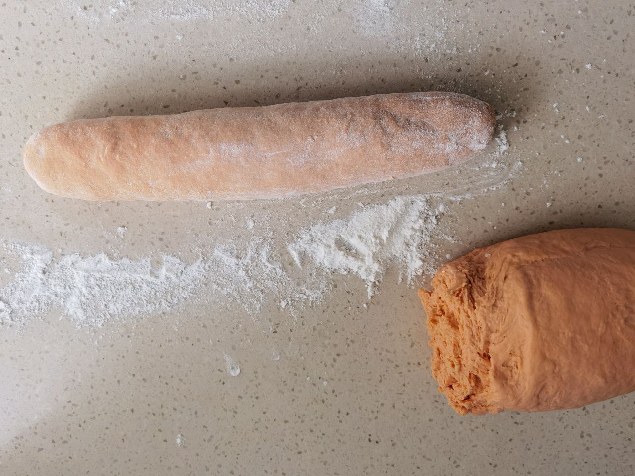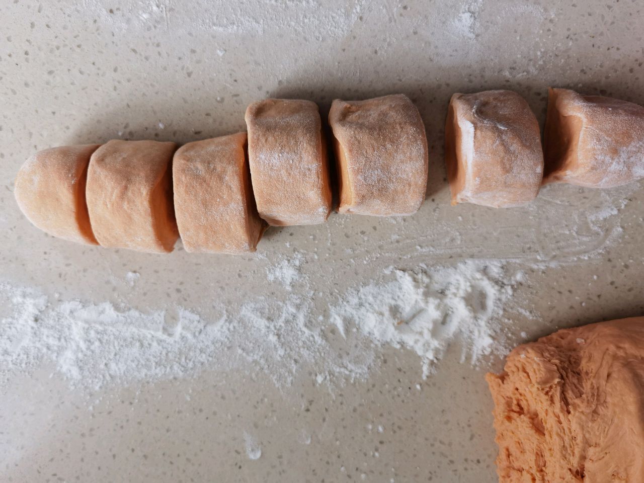步骤6、分成方便操作的小团,揉匀搓成长条,拍一点手粉。