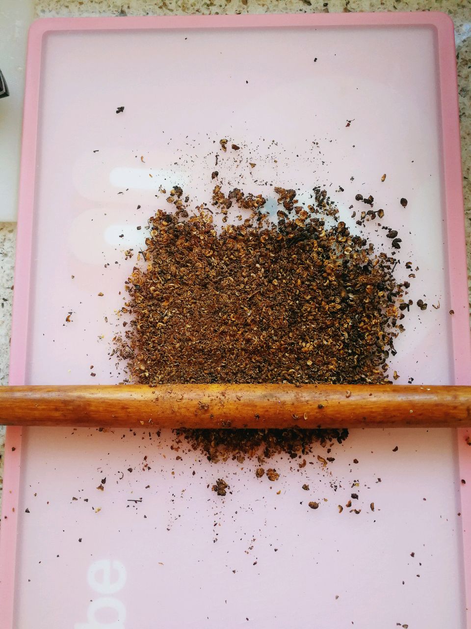 步骤4、用炒勺将花椒粒炒熟出香后,用擀面杖擀成面状备用。
