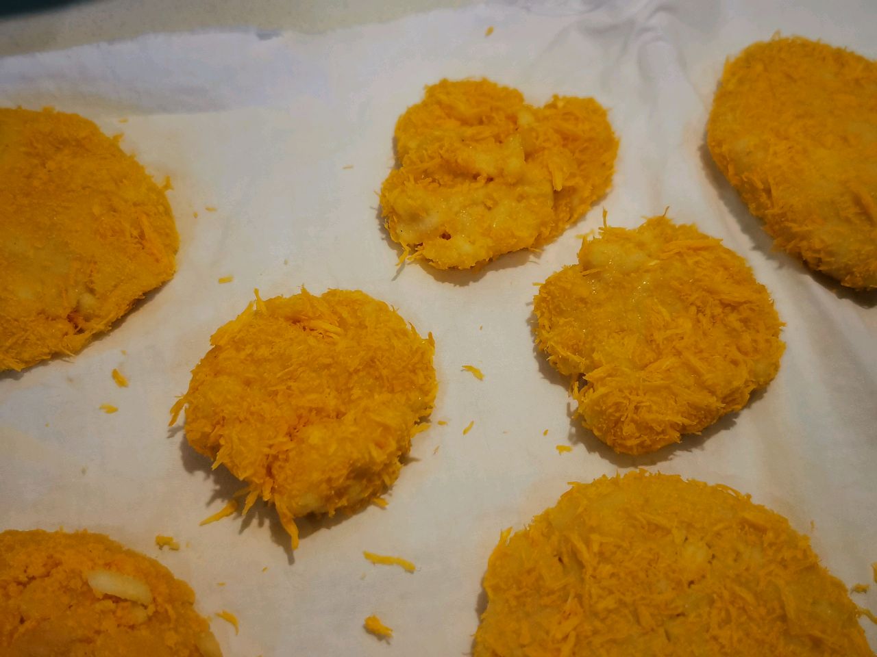 步骤9、糯米团压成饼形外面裹上一层面包糠