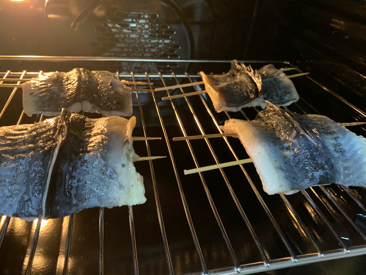 步骤8、用竹签把鳗鱼串起来,200度,烤箱预热后放在烤网上面,每隔5分钟表面刷一遍清酒,共刷三次。