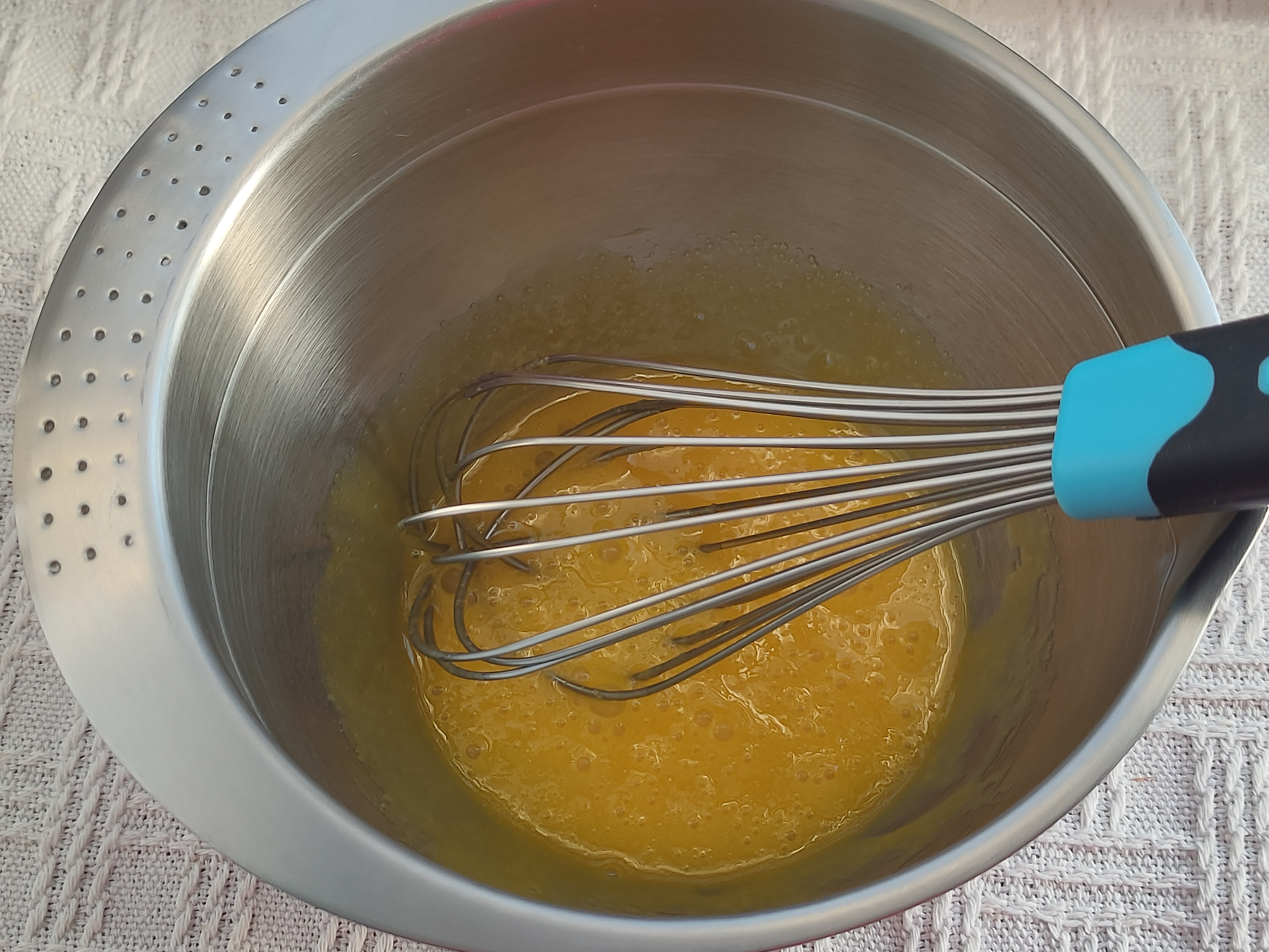 步骤8、打发好的蛋白霜跟蛋黄糊融合,方法跟戚风蛋糕的方法一样。
