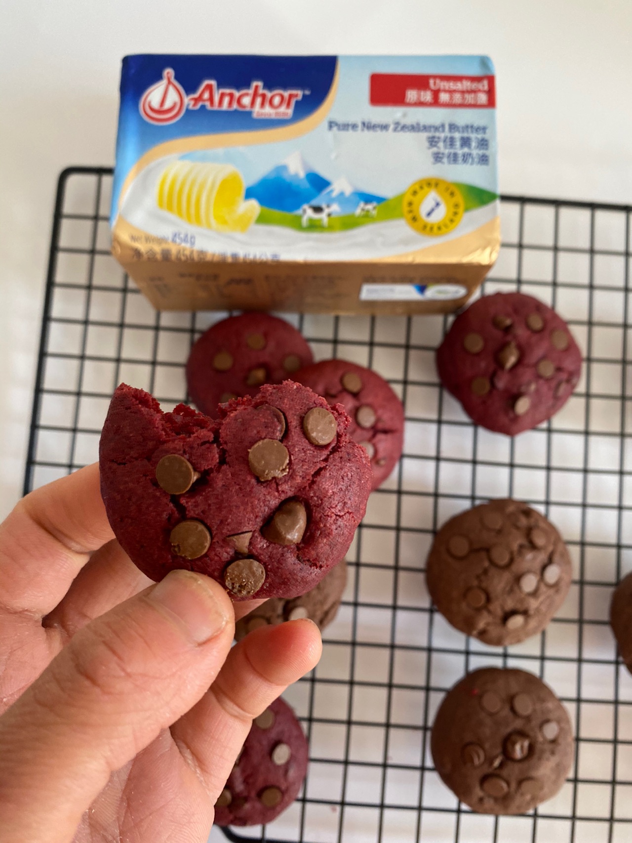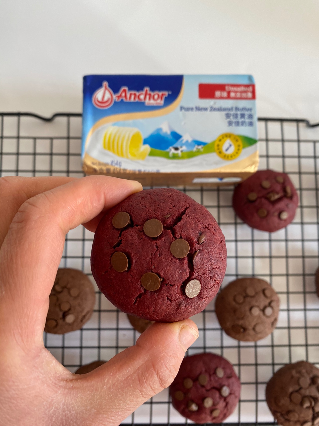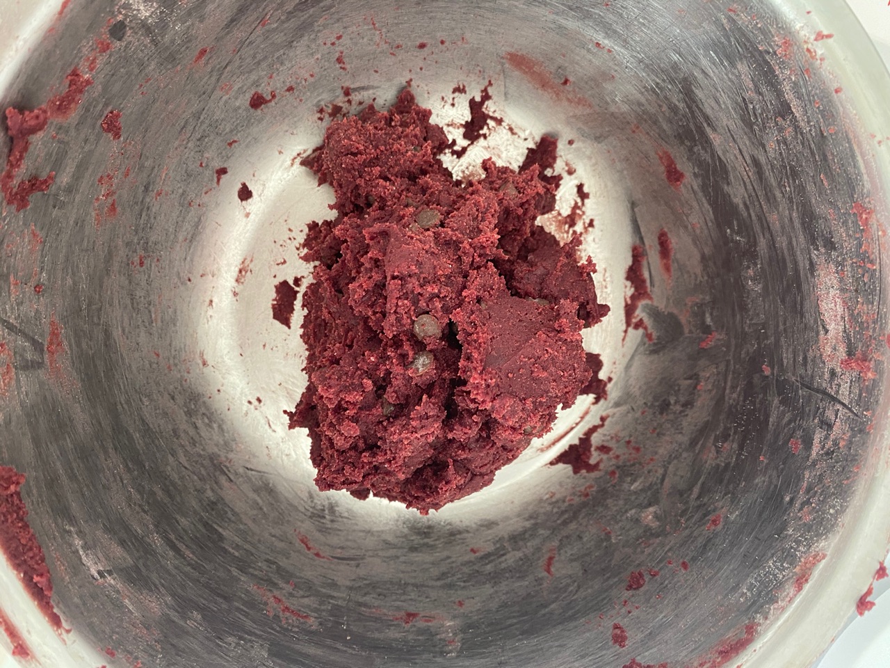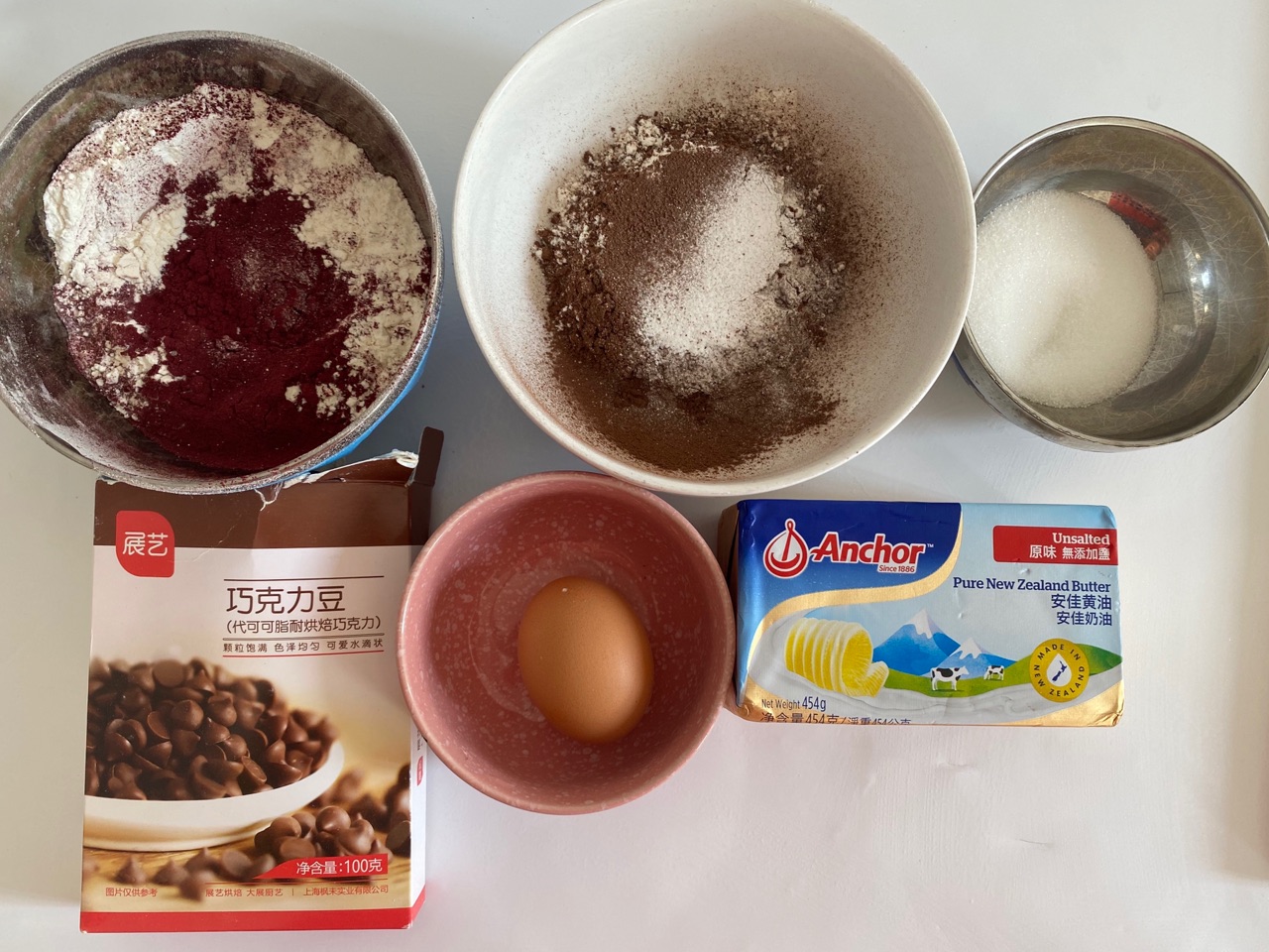 辅料:巧克力粉8克、泡打粉2克、红曲粉8克、白砂糖45克、鸡蛋1个、巧克力豆60克、表面装饰巧克力豆适量
