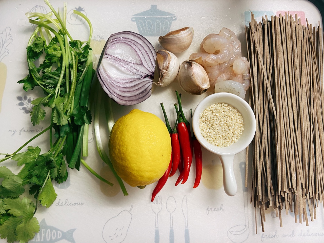 步骤1、准备适量克的荞麦面条(根据个人食量),香菜、小葱,柠檬、洋葱、小米辣椒、大蒜、熟芝麻、虾仁。(有忌口的可以不放、但是个人感觉都放味道超好吃)