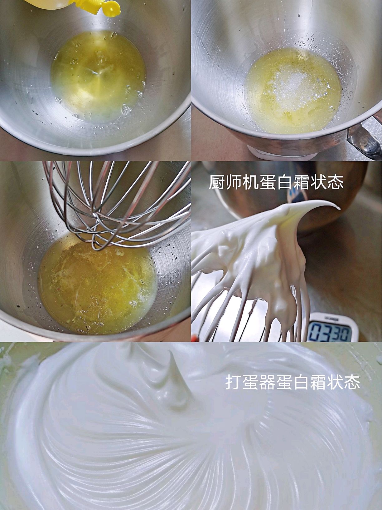 步骤4、4、蛋清+柠檬汁2克+白糖入打蛋盆❗️强调一下,打蛋器和厨师机打蛋白的状态要求是不同的厨师机打蛋白打发至大弯勾偏小弯勾状态(乔立7600用8档打3分钟30秒后停机观察,若不够则加10秒),整体状态为大弯勾偏小弯勾状态电动打蛋器打则是打至小弯勾状态,同时预热烤箱❗️注意观察打蛋盆内蛋白霜状态