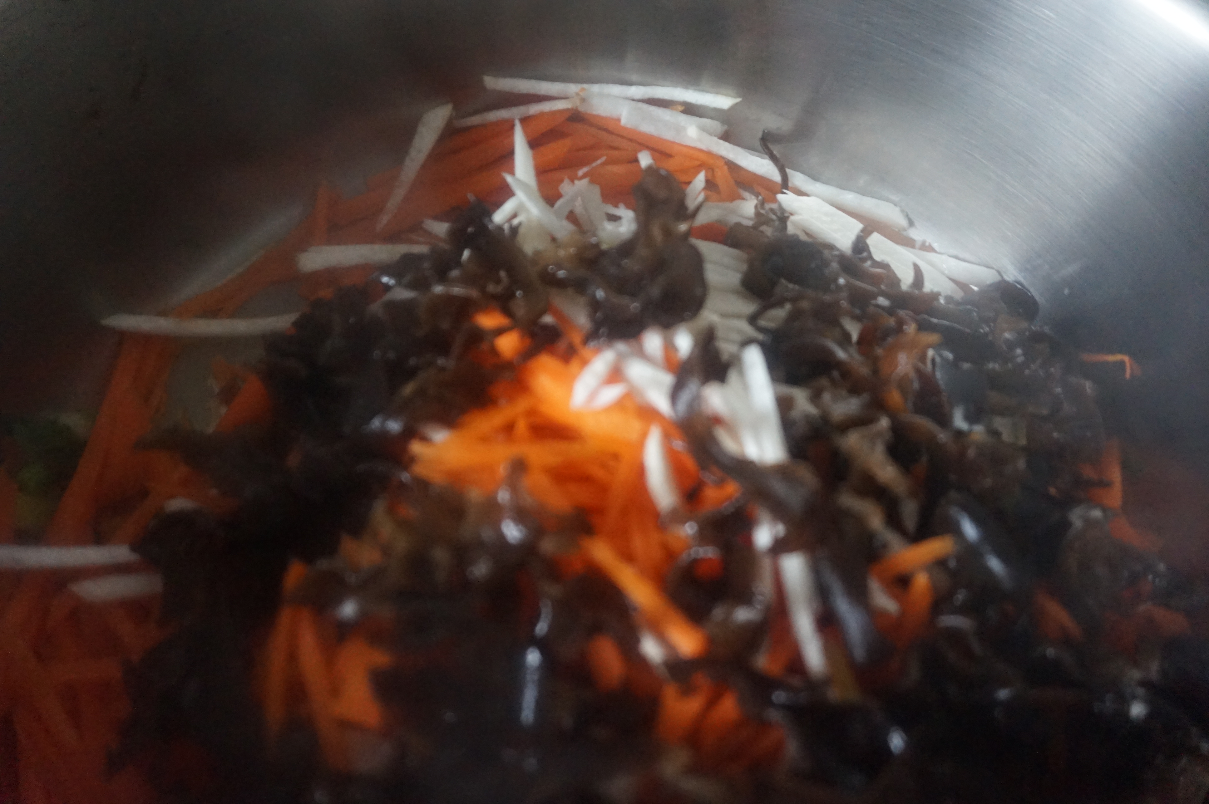 步骤1、准备食材:胡萝卜、杏鲍菇、莴笋洗净切丝,木耳洗净后切丝备用