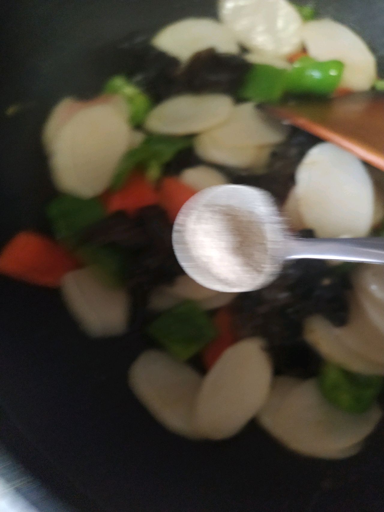 步骤6、再加入焯好水的山药片和木耳,继续翻炒一下。