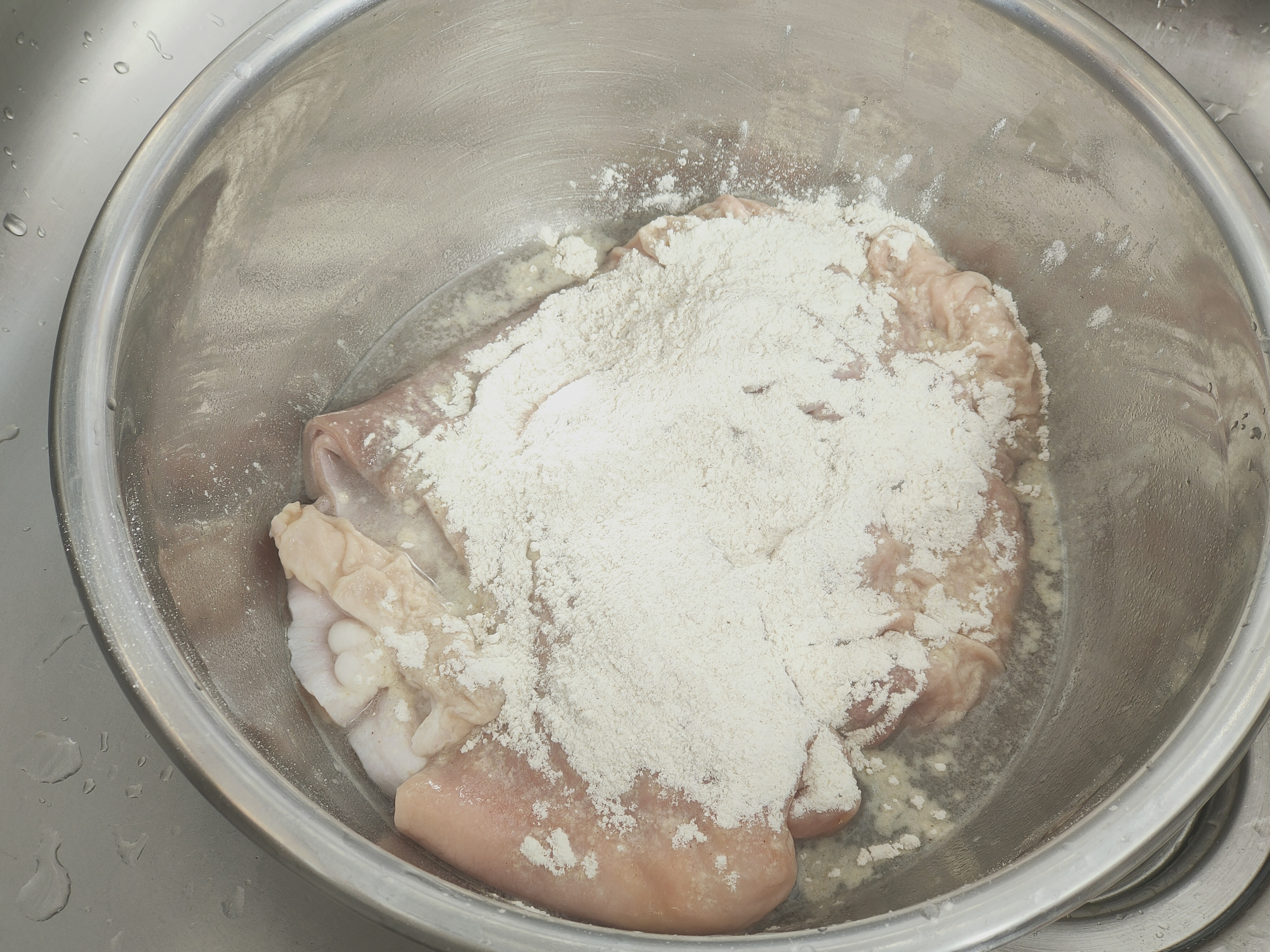 步骤1、刚买回来的猪肚加入适量盐,然后用力揉搓,像洗衣服一样洗,反复揉搓以后,再加入少许面粉揉搓,冲洗干净。