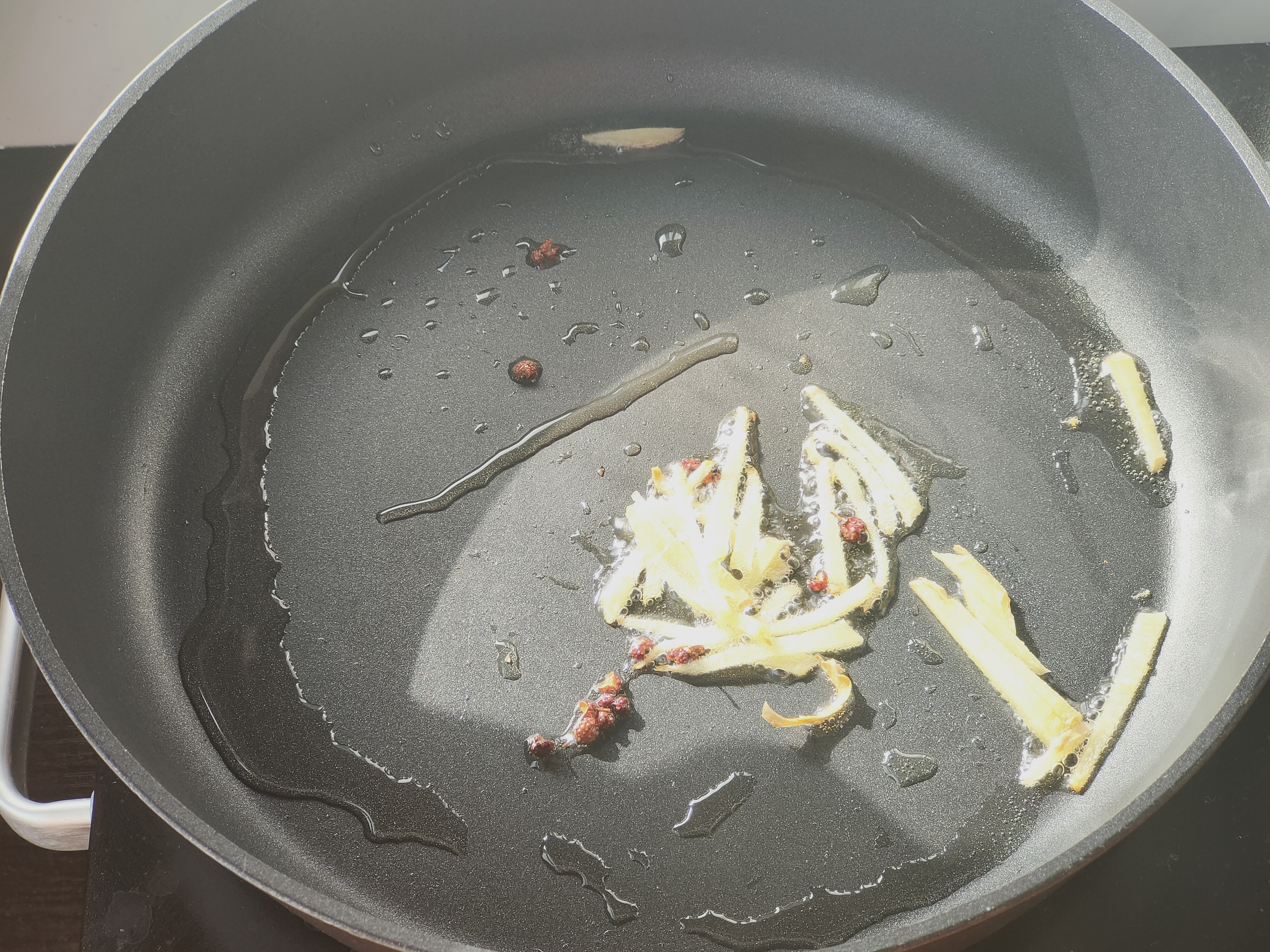 步骤6、起锅热油,下花椒、姜丝爆香。
