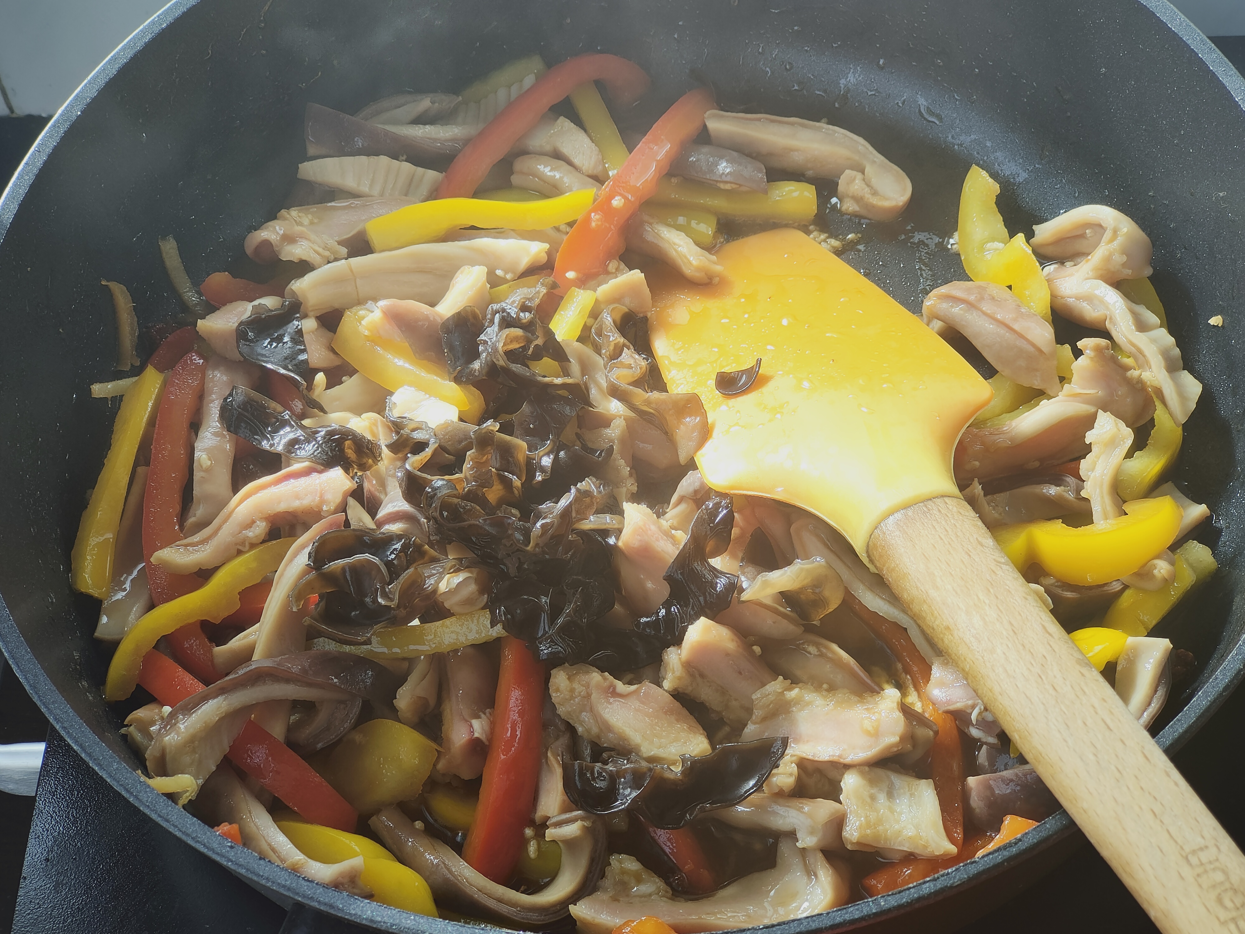 步骤8、下入猪肚丝,再加入2勺低盐牡蛎酱油炒匀。