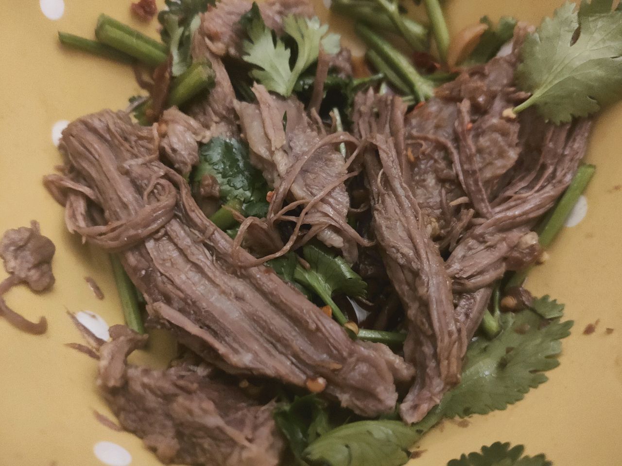 步骤4、取一斤炖好的牛肉,切片,我炖的超烂所以直接切条了,大蒜切蒜末,香菜切碎热锅放炒菜多一倍的油,小火,三个干辣椒拧巴碎扔进去,扔蒜末,花生碎,小火炸香调汁:3汤匙味极鲜+1汤匙蒸鱼豉油+1/2汤匙白醋+1茶匙糖+炸好的蒜末辣椒花生(这是拌2斤牛肉的量)