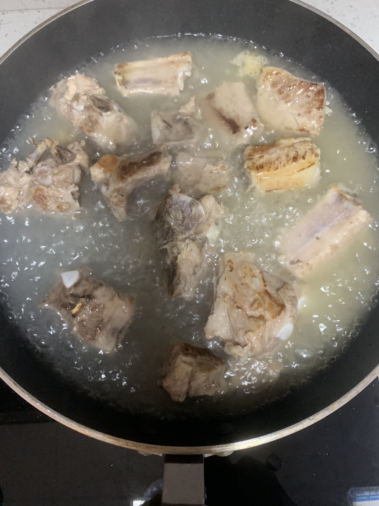 步骤1、排骨清洗干净加入凉水料酒大葱和生姜煮5分钟