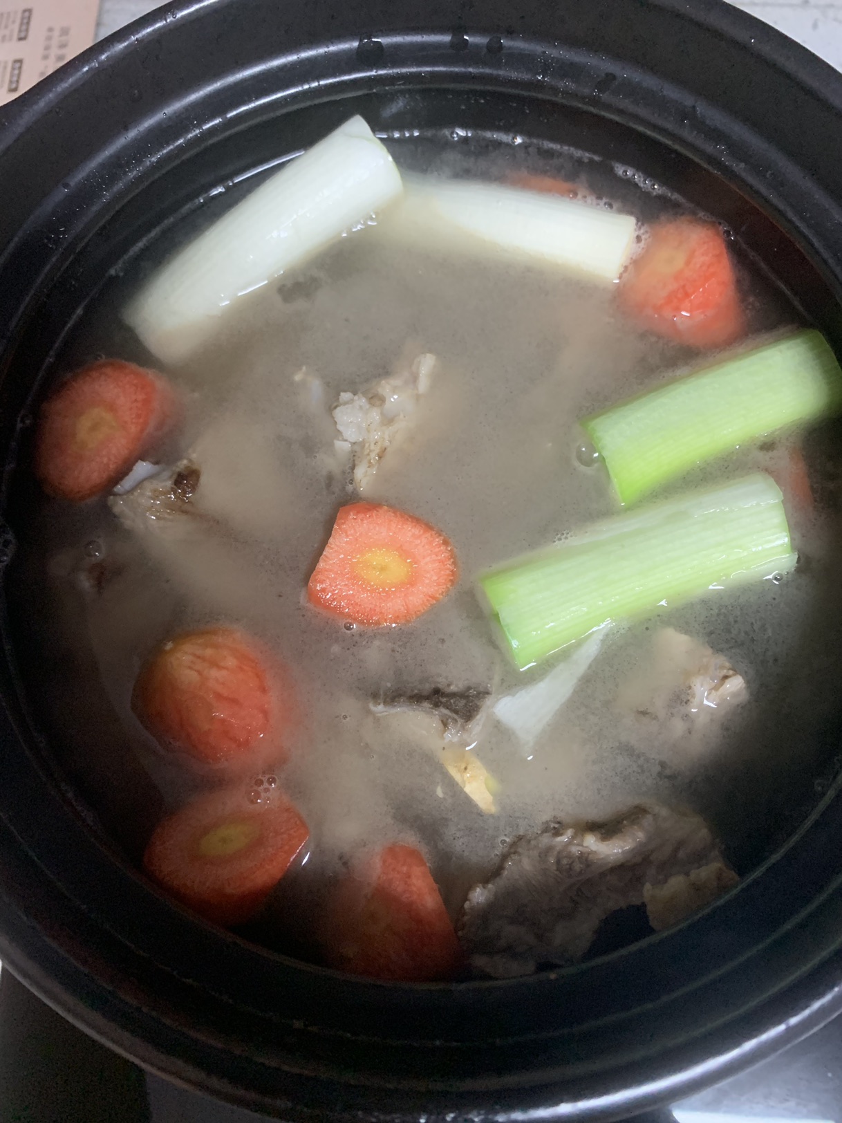 步骤5、倒入砂锅中大火烧开转小火慢炖一小时这时候可以加入配菜(胡萝卜……)