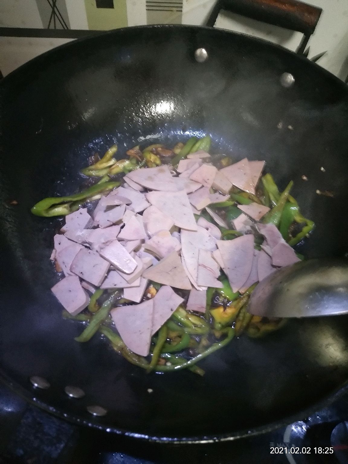 步骤6、加入羊肝,继续翻炒1―2分钟。中途看情况加少量水。(只要确保青椒入味即可,时间长青椒变软就不好吃了)。