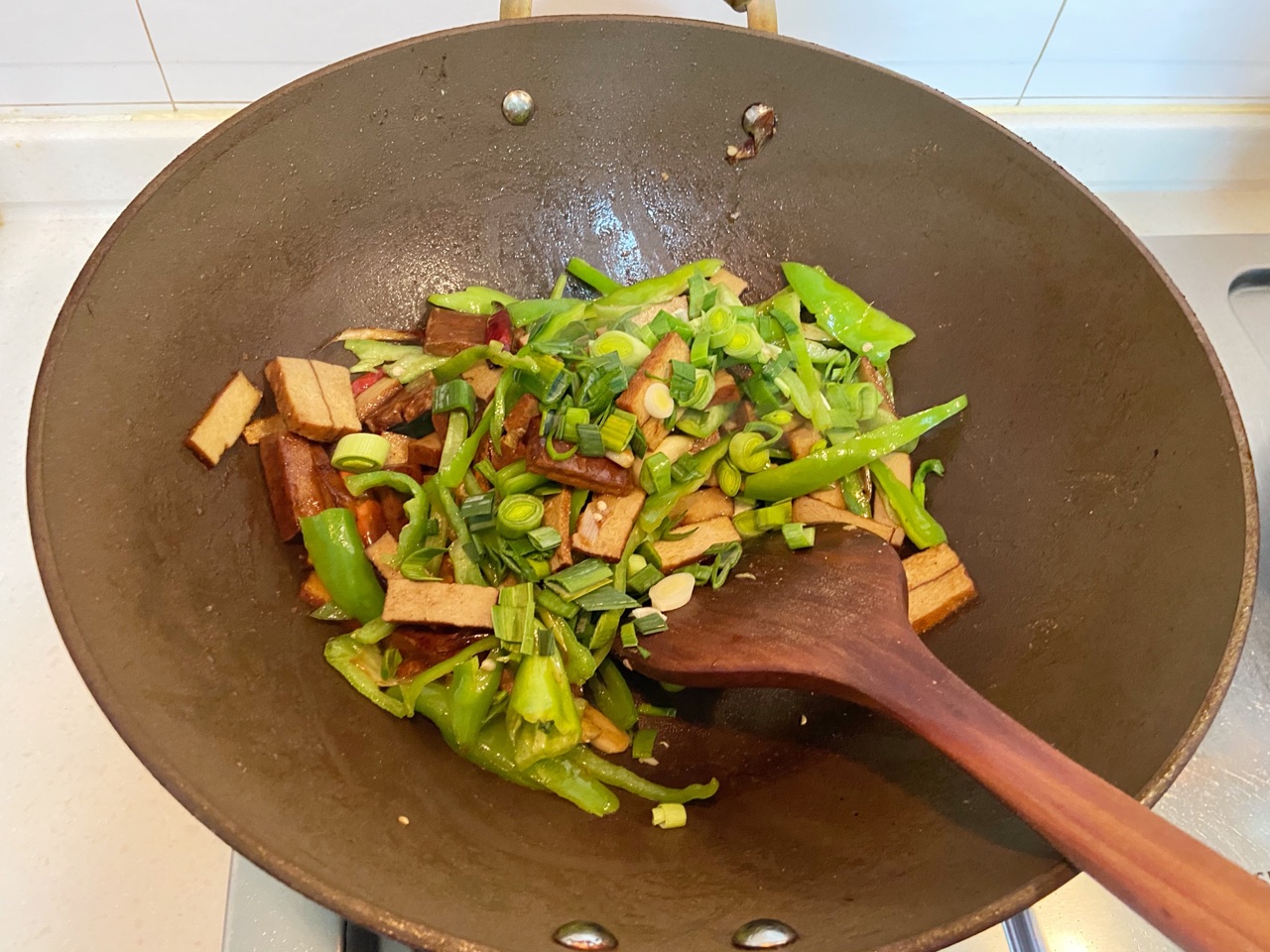 步骤4、倒入香干加一勺味达美醇品蚝油翻炒(香干本身就是熟的,所以不用炒太久)